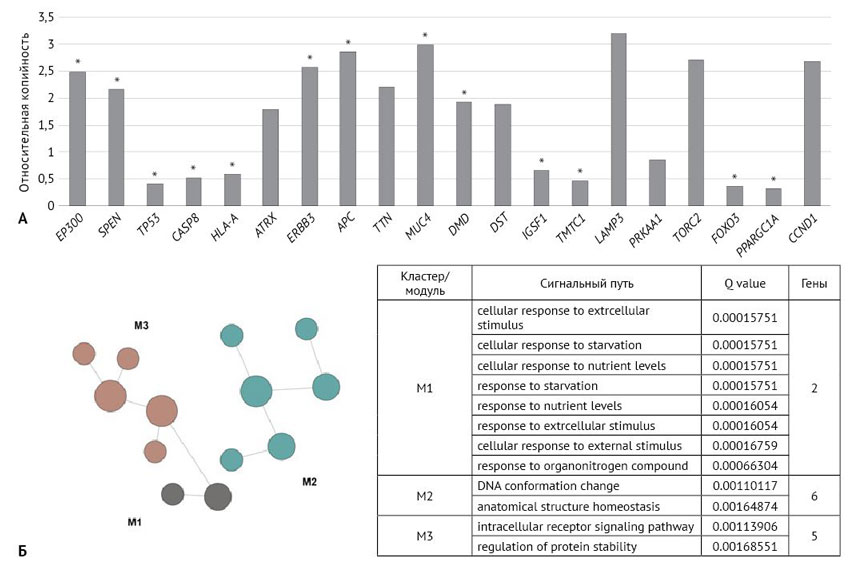 Рис. 4. А. Относительная копийность генов в метастатических опухолевых клетках шейки матки (n=150); *статистически значимые отличия относительно нормальных клеток (p <0,05). Б. Визуализация кластеризации генов по выполняемой функции или участию в сигнальных путях