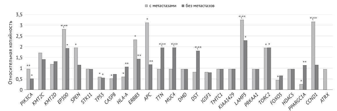 Так, клетки первичной опухоли и метастазов различались по копийности генов CCND1 [в 3,5 раза (р=0,004) выше в клетках метастазов] и PPARGC1A [в 2,8 раза (р=0,041) выше в клетках метастазов]. Статистически значимых различий в копийности других генов между клетками первичной опухоли и клетками опухолевых метастазов из лимфатических узлов не обнаружено.