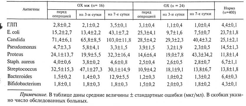 Увеличение концентрации антител к антигенам Candida при ОХ имело схожую динамику с ОХмж, достигая максимального значения к 7-му дню после операции (40,4±3,2 мкг/мл), что более чем в 1,5 раза превышало нормальные показатели. Концентрация антител к антигенам анаэробной микрофлоры кишечника группы Bacteroides при ОХ не изменилась и, оставаясь достоверно низкой, отличалась от аналогичного показателя при ОХмж на 7-е сутки (см. табл.).