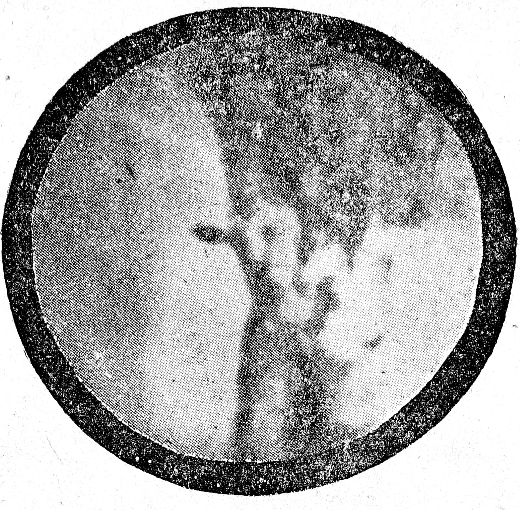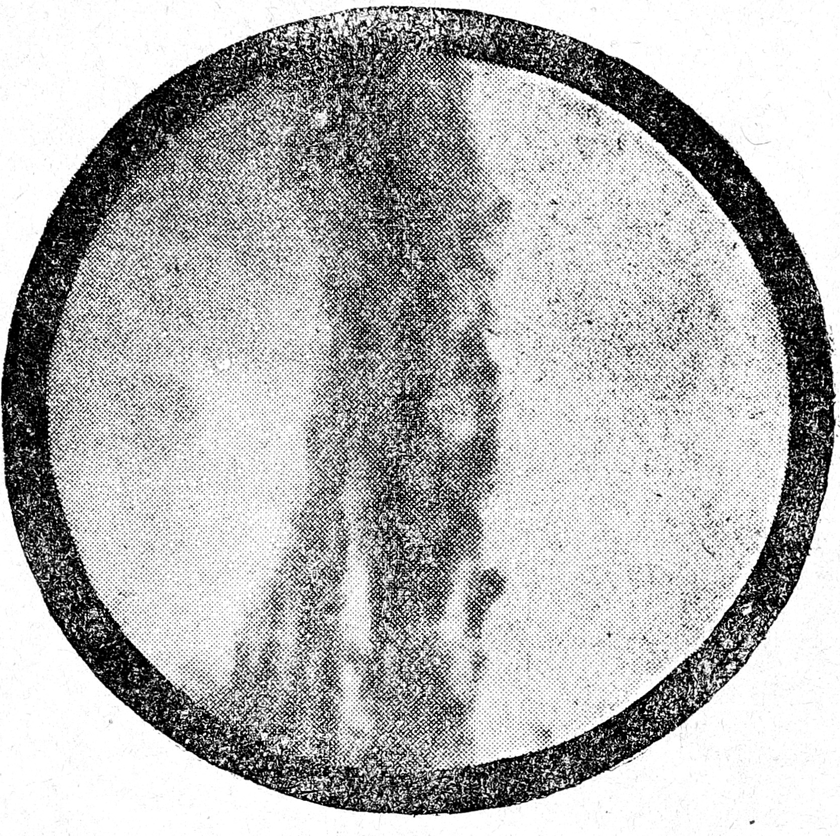 Б-ной С., 43 лет, рабочий-медик, истор. бол. № 12208, поступил в клинику 1|ХII 33. Болен 9 лет периодически появляющимися болями в подложечной области через 20—30 минут после еды, изжогой, рвотой. Явления эти продолжаются обычно 2—3 месяца и исчезают, чтобы через 6—7 месяцев появиться вновь. Аппетит всегда хороший, за последние две недели сильные боли в подложечной области, отдающие в грудную клетку после еды, частая рвота. При исследовании значительная болезненность в подложечной области справа от средней линии при ощупывании и при поколачивании, мышечное напряжение здесь же. Фракционное исследование желудочного содержимого обнаруживает небольшую subaciditas, neutralrot выделился через 35 минут, секреция на повышение. В испражнениях скрытая кровь при повторном исследовании—отсутствует. Рентгеновское исследование 6/ХII,—желудок вытянутый—крючек с хорошо выраженными складками, также проецирующимися вытянутыми; в верхней трети малой кривизны проэцируется большой Ulcuskrater, резко болезненный. Рентгеновский диагноз—Ulcus ventriculi profundum (penetrans) (см. рентгенограмму № 1).