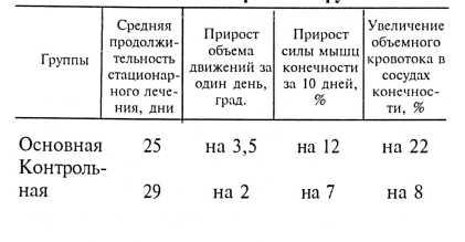 Кроме оценки результатов лечения в целом, анализировали показатели средней продолжительности стационарного лечения, ежедневной функциональной гониометрии, восстановления силы мышц конечности (по данным динамометрии) за 10 дней, показатели объемного кровотока в сосудах конечности (по данным реовазографии с использованием аппарата “Реограф-2РГ” с компьютерной обработкой данных). Полученные данные представлены в таблице.