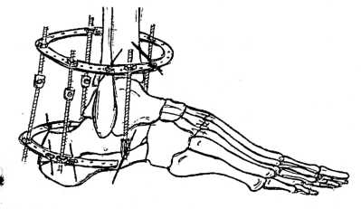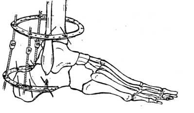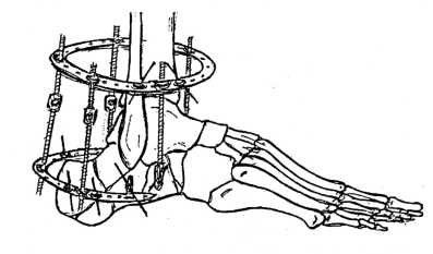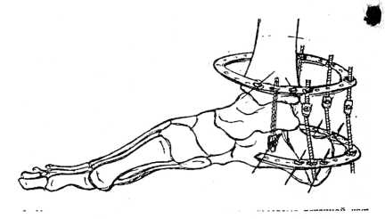 Через дистальный метафиз большеберцовой кости проводят две перекрещивающиеся спицы и закрепляют на кольцевой опоре. Через бугор и тело пяточной кости проводят еще две спицы перпендикулярно сагиттальной плоскости, причем через тело пяточной кости — спицу с оливой или упорной площадкой со стороны, противоположной смещению крупного промежуточного фрагмента. Свободные концы спиц закрепляют на полукольцевой опоре. Опоры соединяют между собой с помощью трех резьбовых стержней с шарнирами. Перемещением опоры по стержням в дистальном направлении устраняются грубые смещения отломков и восстанавливается продольный свод стопы. Производят контрольную рентгенограмму пяточной кости в боковой проекции.