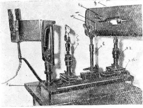 Вперед и назад подставка б передвигается рукояткой к, которой заканчивается проходящий под плитой длинный винт, припаянный к подставке б.