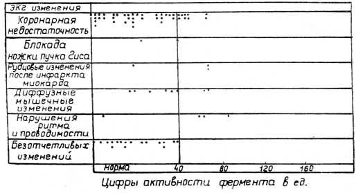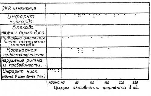 У больных стенокардией, а также инфарктом миокарда, поступивших в сроки более 7 дней с момента болевого приступа, при получении цифр активности, не превышающих нормальные, повторные исследования проводились не всегда и главным образом — при появлении повторного приступа болей. Если цифры активности превышали норму, то исследование проводилось повторно — от 2 до 4 раз.