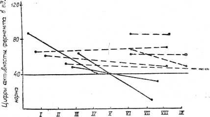 Как видно на рис. 1, нормальные цифры активности получены нами у 62 больных. У 14 больных цифры активности превышают 40 ед. В динамике было исследовано 9 из них, результаты представлены на рис. 2.