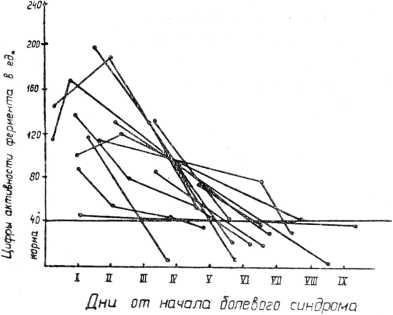 Как видно на рис. 2, лишь у 3 больных активность фермента приходила к норме к 6—7 дням от начала болей, у 6 больных снижение активности не происходило и к 8—10 дням.