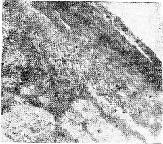 Рис. 1. Нити фибрина в просвете бедренной артерии. Микрофото. Окраска гематоксилин-эозином. Увеличение 40 X 10.