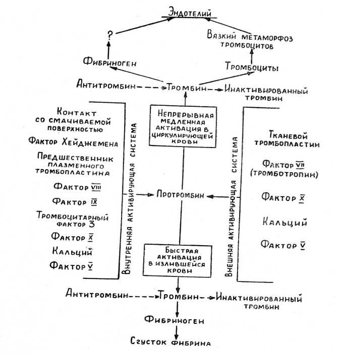 Появление в крови избыточного количества тромбина рефлекторно возбуждает к действию физиологическую антисвертывающую систему, которая детально изучается Б. А. Кудряшовым и сотрудниками (9— 15). Кроме тормозящего влияния прямых антагонистов свертывания крови, при чрезмерном образовании тромбина происходит уменьшение фибриногена, протромбина, антигемофилического глобулина, тромбоцитов либо путем потребления, либо путем аутокаталической инактивации. В большинстве случаев таким образом удается достичь нового уровня равновесия, так что отложение фибрина замедляется, а затем уменьшается из-за увеличения фибринолитической активности крови (12). Однако такое равновесие менее устойчиво, и оно при устранении причины сдвига стремится к исходному положению. Если же противосвертывающая система не в состоянии достаточно эффективно противостоять избыточному образованию тромбина, то может развиться тромбоз, особенно в участках с замедленным кровотоком и поврежденным эндотелием.