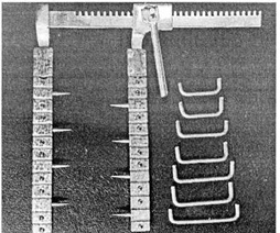 Аналогично гибкой конструкции предложен ИАРА [32], содержащий острые крючки, расположенные на двух пластмассовых полосах. На внутренней поверхности одной из них имеется продольный пуговичный выступ, который входит в прорезь, сделанную на другой полосе, и таким образом они смыкаются. Такой замок не гарантирует стабильной фиксации тканей в зоне сжатия. Недостатками подобного рода обладает описанная модель ИАРА [29], представляющая собой металлическую проволочную рамку, объединяющую блок параллельно установленных подвижных скобок Мишеля. Концы каждой скобки внедряют в ткани краев раны путем их сгибания. Несмотря на общедоступность и простоту наложения серкляжного АРА, он имеет ограниченное применение.