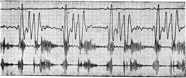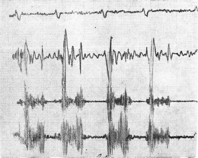 На ФКГ больного К. (рис. 3) виден грубый «пансистолический» шум, на основании которого была диагностирована митральная недостаточность и больному отказано в производстве комиссуротомии. На секции митральная площадь не превышала 0,4 см2. В другом случае грубый систолический шум сочетался с ранним мезо диастолическим шумом, который в финале болезни исчез. Систолический шум у этих больных сочетался с усиленным первым тоном и удлиненным интервалом Q — 1 тон.