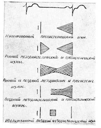 Важное значение в диагностике митрального стеноза имеют шумы диастолического периода. Графическое изучение их и сопоставление с аускультативными данными позволяют говорить о различных комбинациях этих шумов. В связи с тем, что длительность и время возникновения мезодиастолического шума у больных митральным стенозом варьируют в широких пределах, и в целях отличия его от протодиастолического шума (встречающегося только при аортальной недостаточности), мы считаем целесообразным различать ранние и поздние мезодиастолические шумы. К раннему мезодиастолическому шуму следует относить шум, который возникает вслед за щелчком открытия. Если же интервал между щелчком открытия и шумом составляет более 0,1", то такой шум следует считать поздним мезо диастолическим. Протодиастолический шум начинается непосредственно после основных колебаний второго тона или сливается с ними.