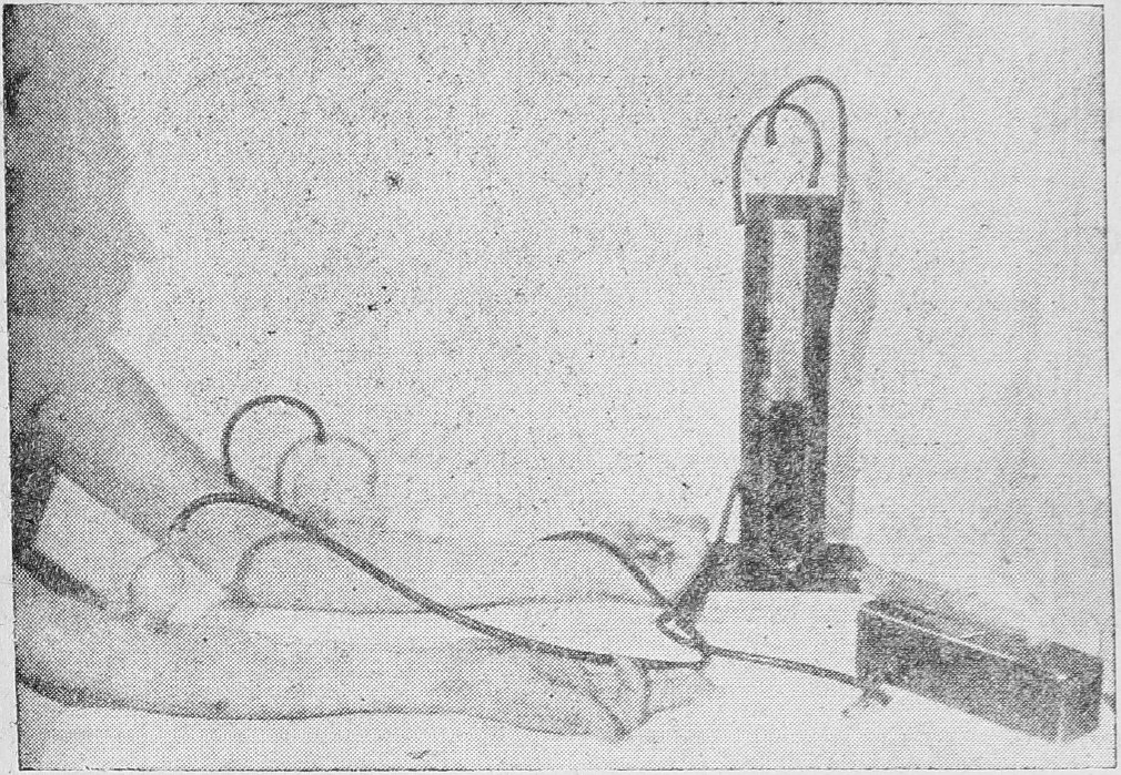 Аппарат, предложенный Нестеровым, сконструирован следующим образом: на деревянном штативе установлено 2 ртутных манометра закругленных и сообщающихся внизу. Один верхний конец открыт, другой соединен резиновой трубкой с небольшой баночкой (19 мм в диаметре). От резиновой трубки идет ответвление, через которое выкачивается воздух из баночки, создавая отрицательное давление в ней. В процессе работы я пришел к заключению, что, экспериментируя одной баночкой, можно допустить неточность, так как часто результаты опыта зависят от степени натяжения и места пробы.