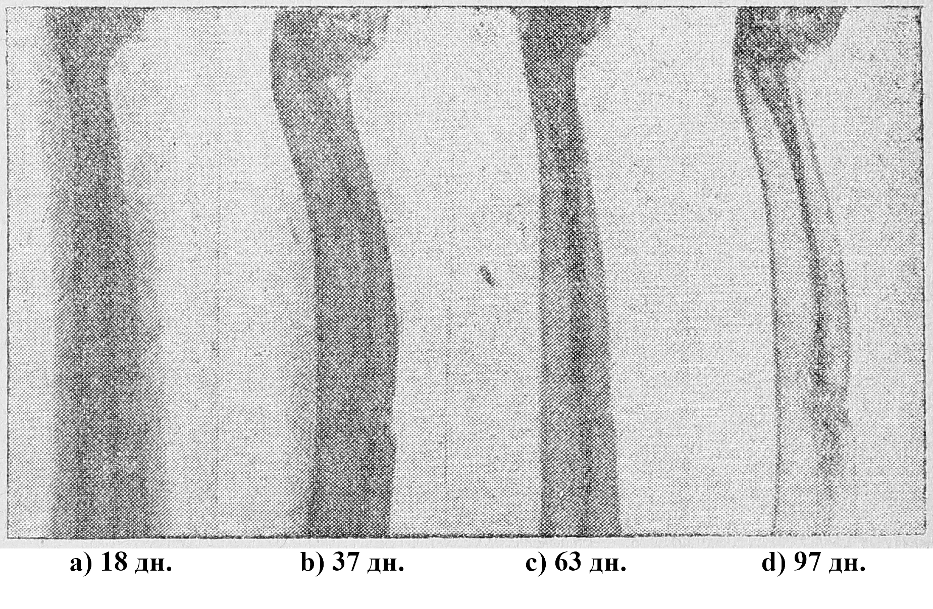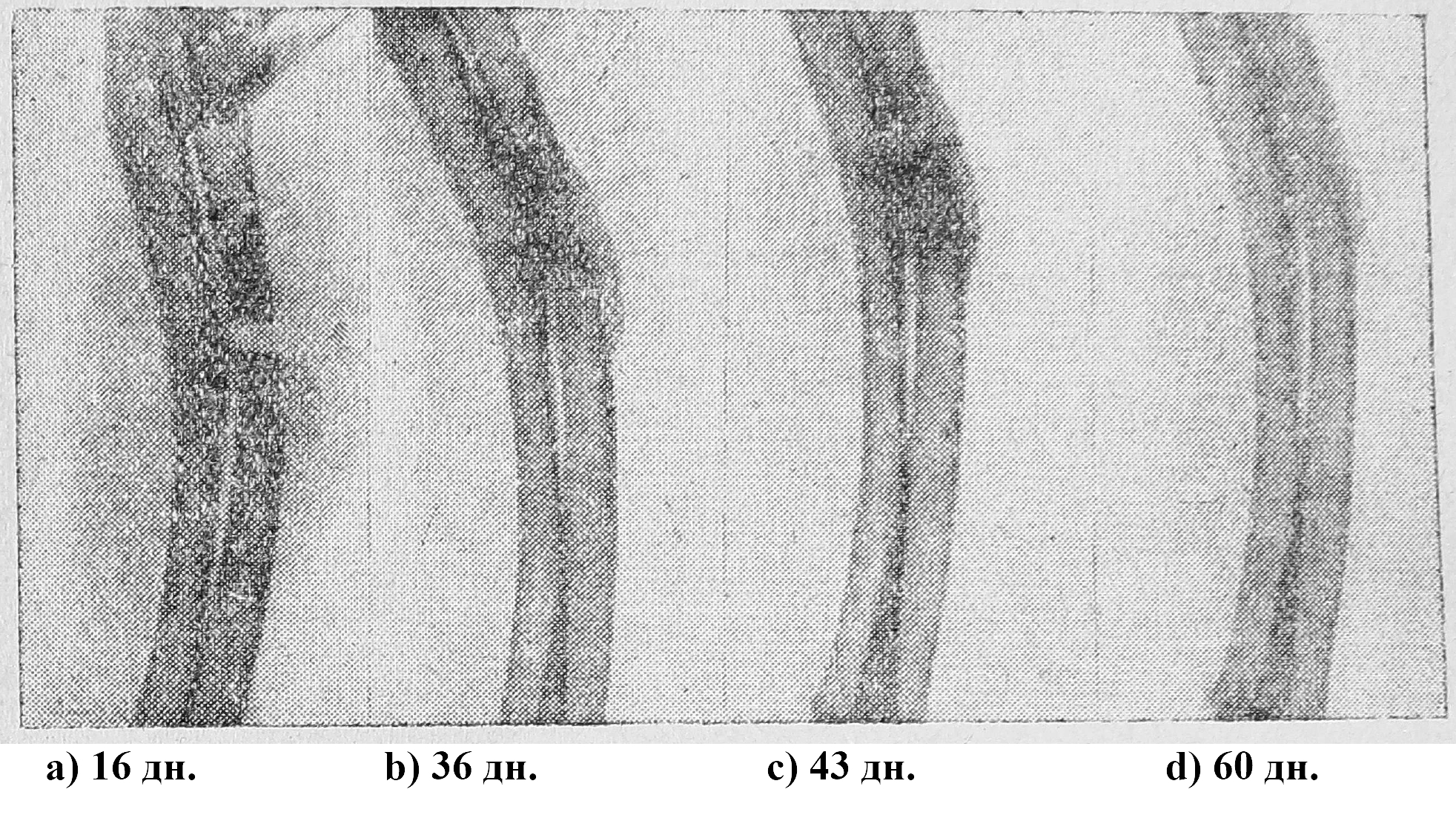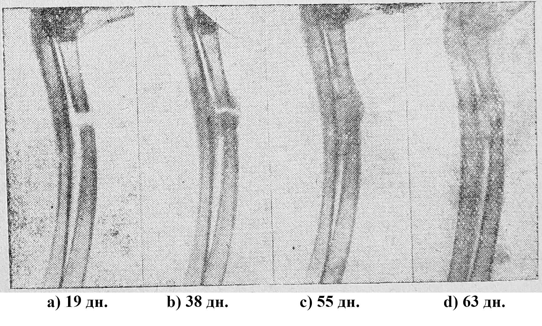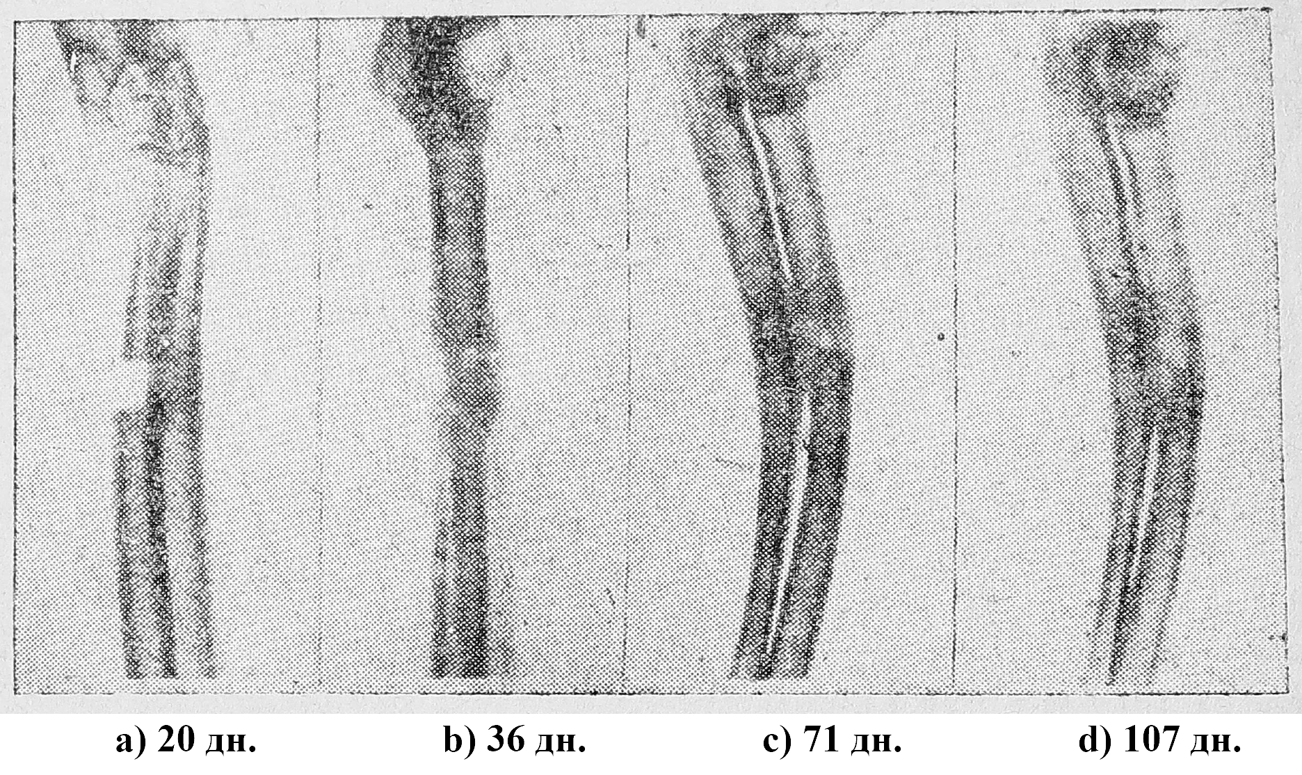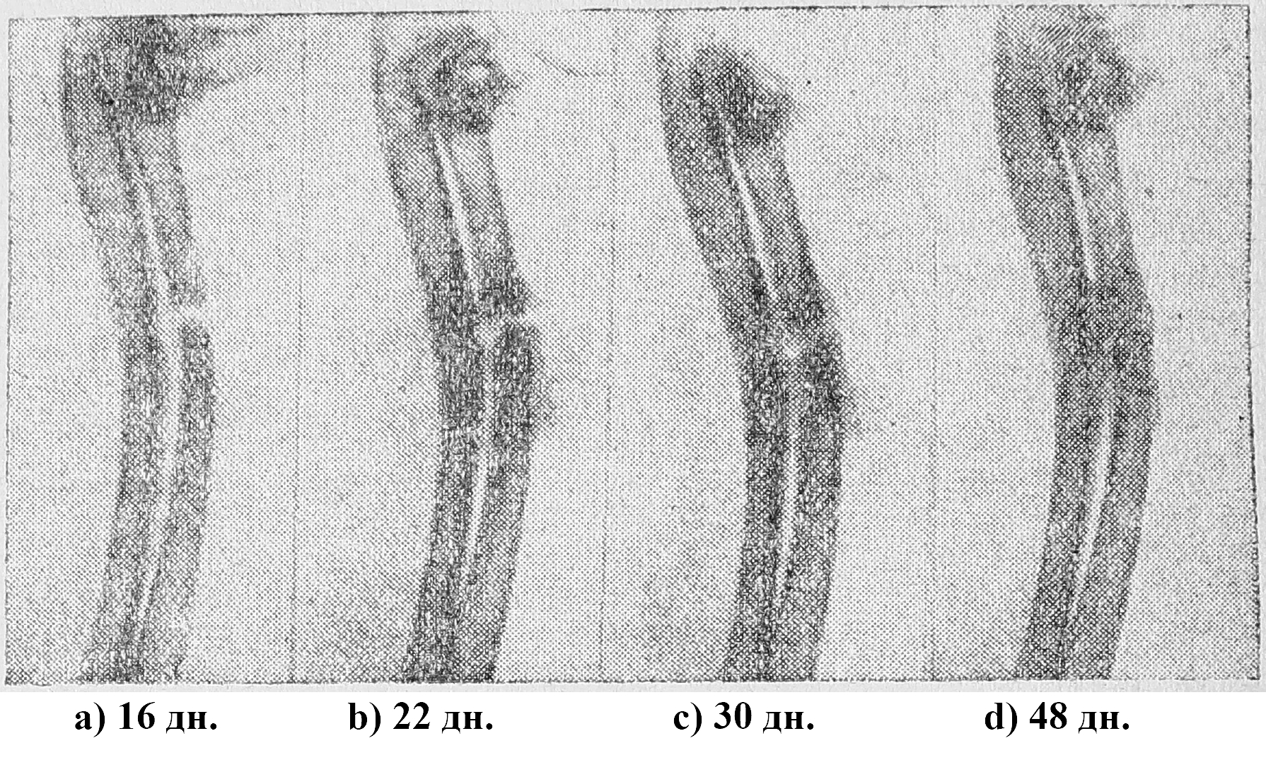 Так как исследования Буркгард и Панкратьева показали, что наибольший эфект достигается инъекциями суспензии костной муки в коллоидном веществе, то мы наряду с указанными выше веществами в чистом виде применяли их в соединении с костной мукой. Указанные выше вещества мы впрыскивали в область дефекта. При этом первое впрыскивание мы производили на 8—10-й день после операции, считая необходимым дать стихнуть явлениям, связанным непосредственно с операционной травмой. После дующие опрыскивания производились нами через каждые 6 дней и прекращались к моменту наступления заполнения костного дефекта. Каждый опыт сопровождался рентгенологическими исследованиями через каждые 10 дней до наступления полной консолидации.