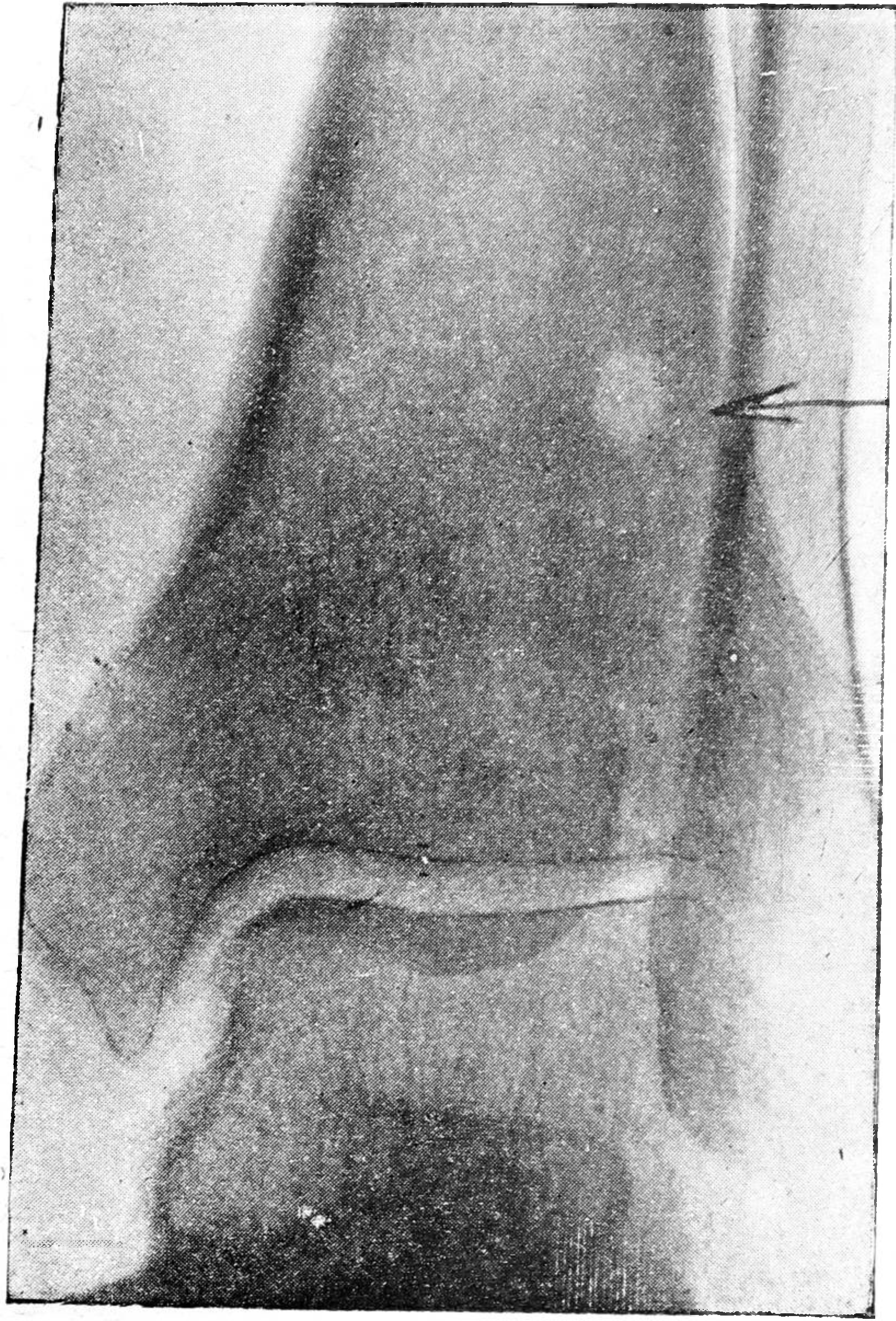 Случай 3. Больной Р., 22 лет. Колхозник. Обратился 10/IV 34 г. в рентгенологическое отделение ин-та для снимка дистального отдела левой голени и левого голеностопного сустава.