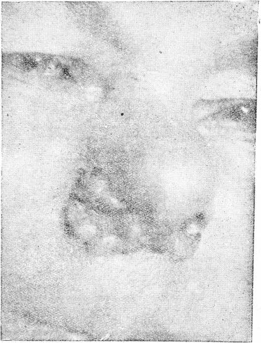 В нашем случае мы отбрасываем предположение, что имеется вульгарное изъязвление склеромного инфильтрата. Против этого предположения говорит довольно типичный для эпителиомы вид язвы, ее морфологические особенности. Меньше всего можно было ожидать при вульгарном изъязвлении столь торпидное течение, с наклонностью к дальнейшему распаду. Также отсутствуют в анамнезе указания на травматизм или другие непосредственные причины, могущие вызвать изъязвление. Преимущественное увеличение регионарных подчелюстных желез также можно условно принять во внимание.