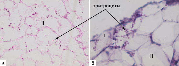 Рис. 1. Адгезия эритроцитов к брюшине. Окраска гематоксилином и эозином: а — увеличение ×100; б — увеличение ×400; I — мезотелий; II — пограничная базальная мембрана