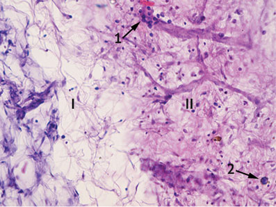Рис. 2. Микроскопия на 3-и сутки. Окраска гематоксилином и эозином, увеличение ×400: 1 — рекрутирование лейкоцитов; 2 — активация перитонеальных макрофагов; I — пограничная базальная мембрана; II — собственная пластинка брюшины