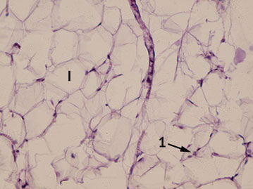 Рис. 3. Париетальная брюшина на 10-е сутки. Окраска гематоксилином и эозином, увеличение ×400: 1 — лейкоциты; I — пограничная базальная мембрана