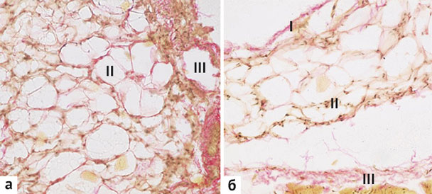 Рис. 4. Препараты париетальной брюшины на 20-е (а) и 30-е (б) сутки. Окрашивание гематоксилином Вейгерта (по Ван-Гизону), увеличение ×100: I — мезотелий; II — пограничная базальная мембрана; III — собственная пластинка брюшины