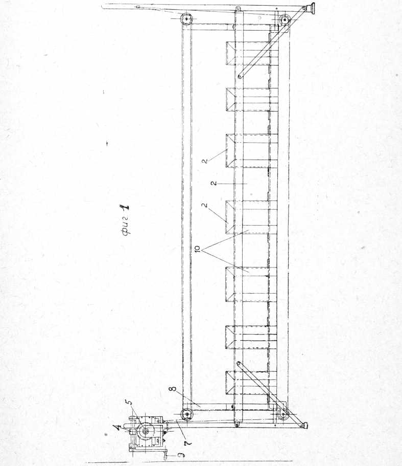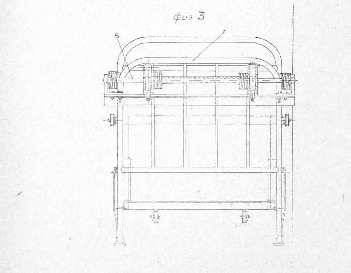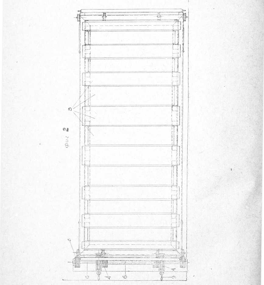 рам (2), с натянутыми поперек брезентовыми лентами, или другими плоскостями-опорами, как-то: резиновые трубки, накаченные воздухом и т. п., служащими опорой для больного. Рамы (2) опускаются и поднимаются при помощи подъемных механизмов, представляющих собой самотормозящие червячные передачи (4), с помощью которых на барабаны (5), насаженные на валы (6) червячных колес, наматывается трос (7), на котором лежат рамы (2) одна из них представляет собой вид ломаной линии), опирающиеся на тросы блоками. Рамы двигаются в направляющих стойках. Для ограничения высоты подъема и опускания рам, в соответствующие отверстия направляющих стоек (8) вставляются ограничители, представляющие собой обыкновенные болты с толстыми шайбами. Поднимание и опускание плоскостей можно осуществить с помощью общего вала, находящегося под плоскостями, и 2 вертикальных винтов, связанных с шестернями и т. п.