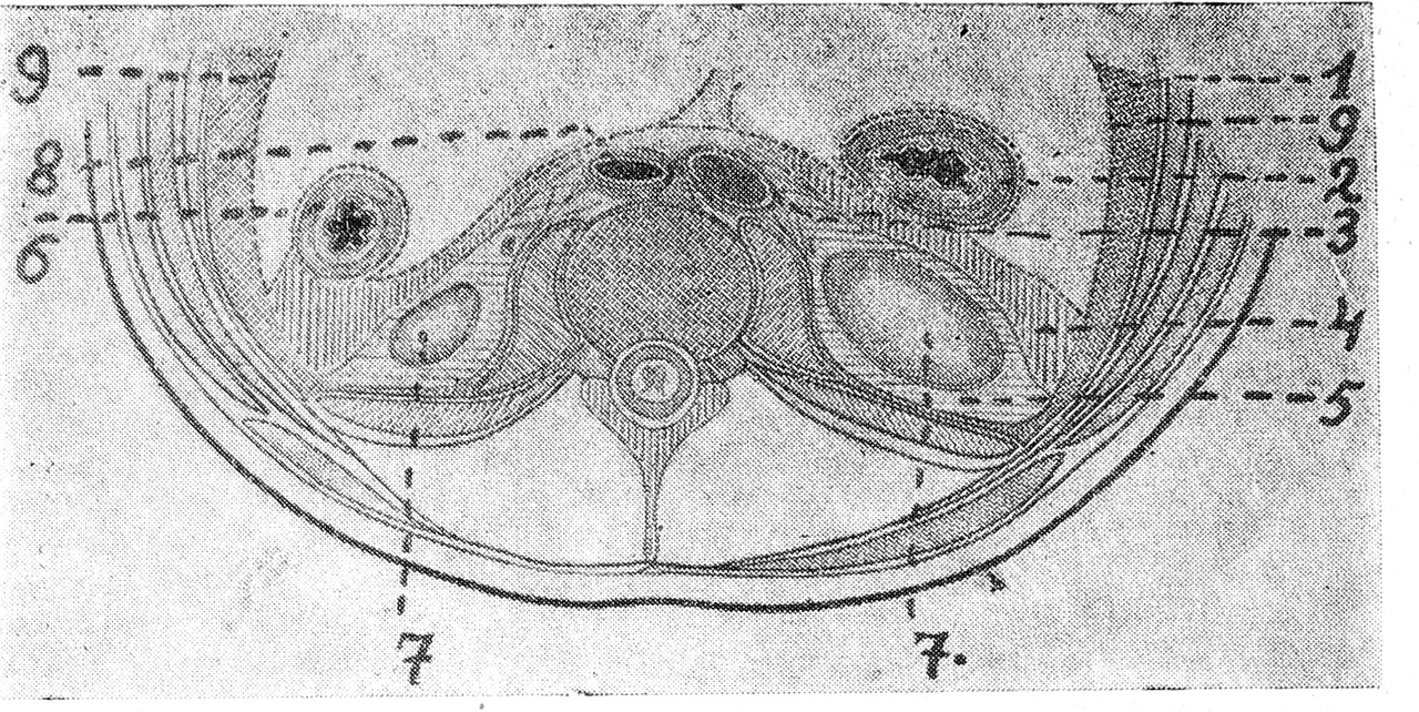 Рис. 1. Поперечный разрез через область почек: 1) tela subserosa, 2) pars ascendens colonis, 3) нижняя полая вена, 4) параколон, 5) паранефрон, 6) pars descendens colonis, 7) почки, 8) брюшная аорта, 9) брюшина.