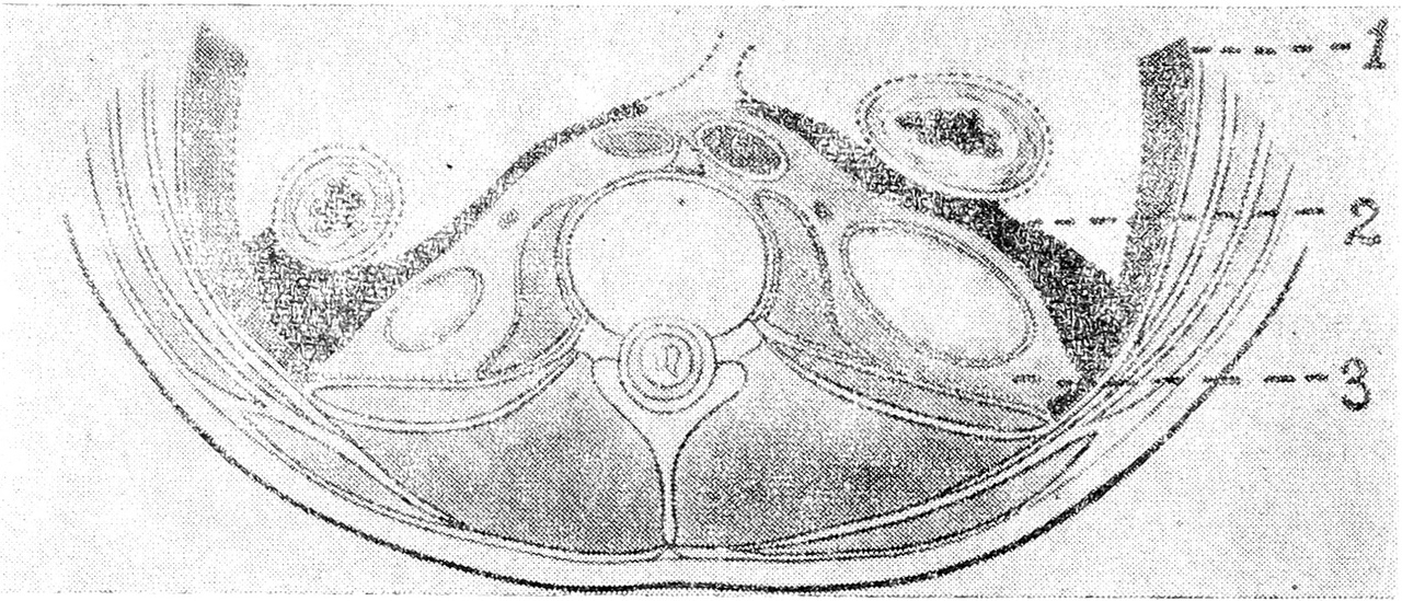 Рис. 2. Местоположение гематом в забрюшинном пространстве: 1) гематома в tela subserosa, 2) гематома в параколоне, 3) гематома в паранефроне.