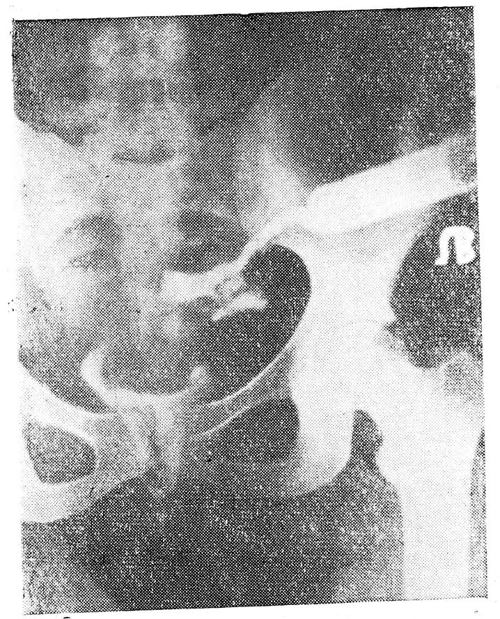 10/ІХ 1964 г. в свищевое отверстие введено 8 мл 50% раствора трийотраста. На рентгенограмме (см. рис.) видна канюля шприца, введенная в свищевое отверстие. Свищевой канал протяженностью до 5 см, шириной до 0,5 см, с четкими, ровными контурами, идет медиально, на уровне 4-го крестцового позвонка резко расширяется и образует неравномерное скопление контраста размерами 5x2,5 см. Контрастировалась полость матки. Между отмеченным скоплением контрастного вещества в брюшной полости и телом матки выявляется извилистая, тоненькая (до 1,5 мм в диаметре), местами прерывающаяся контрастированная полоска — тень трубы. Заключение: брюшностеночно-трубный свищ.