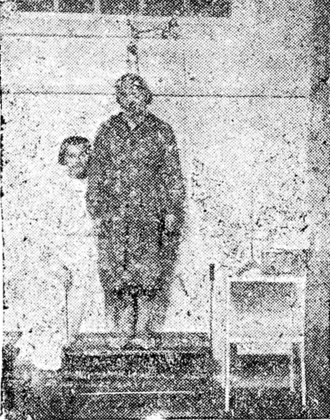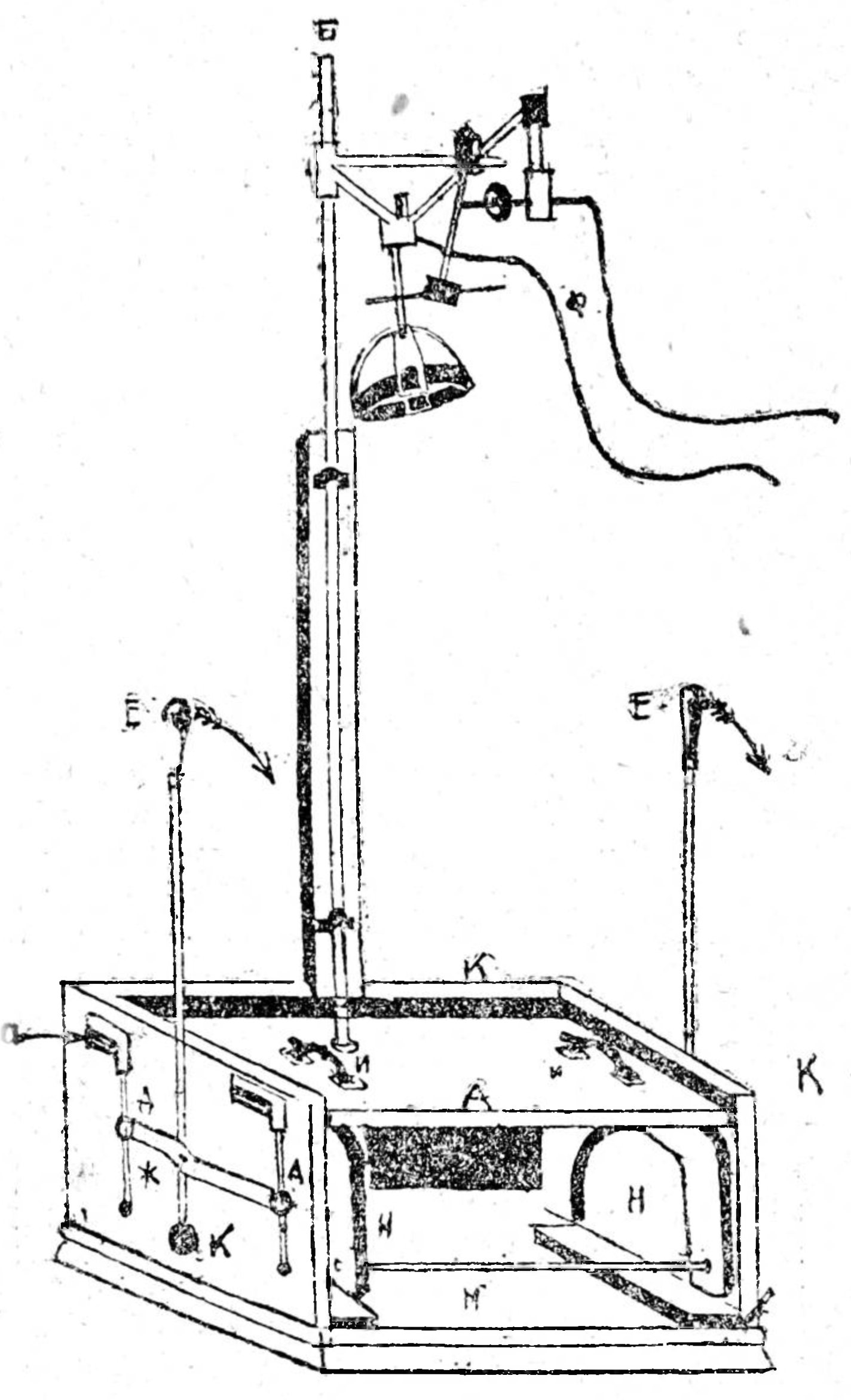 Прибор представляет (см. рис. 1) ящик с тремя стенками (К) и дном (Мн Внутри ящика имеется горизонтальная платформа (А) которая может передвигаться вверх и вниз; на ней укреплен штатив (Б), который в верхней своей части несет обыкновенный кефалограф (Ф). На рисунке изображено положение платформы в начале опыта: платформа находится на высшей своей точке, опираясь на четыре шпенька, которые поддерживают ее снизу. Шпеньки эти (а) расположены по два с каждой стороны и проходят через щели в боковых стенках ящика. Снаружи (на рис. изображена левая боковая стенка) шпеньки захвачены скобкам (Д). Если повернуть рычаг Е по направлению стрелки, то через посредство особой планки (Ж) скобки (Д) отойдут в сторону и освободят концы шпеньков Так как последние вращаются на шарнире, то под тяжестью платформы (и находящегося на ней испытуемого, они повернутся вокруг своей оси и скроются в щелях боковой стенки, а платформа, лишившись опоры, упадает на дно (М ящика и встанет на свои ножки (Н). Для ослабления удара ножки снабжен снизу резиновыми подкладка ми. На правой боковой стенке имеются такие же шпеньки и скобки, как и на левой; приводятся они в действие рычагом Е, одновременно с левым рычагом. Амплитуда опускания платформы регулируется тем, что на дно ящика кладутся доски различной толщины. При отсутствии досок, когда ножки платформы достигают дна, амплитуда спуска составляет 20 см. Подложив под ножки доски в 15, 10 или 5 см., мы изменяем амплитуду до 5, 10 или 15 см—Чтобы поднять платформу (А) после опыта, ее берут за ручки (И), предварительно поставив рычаги (Е Е) в первоначальное положение.