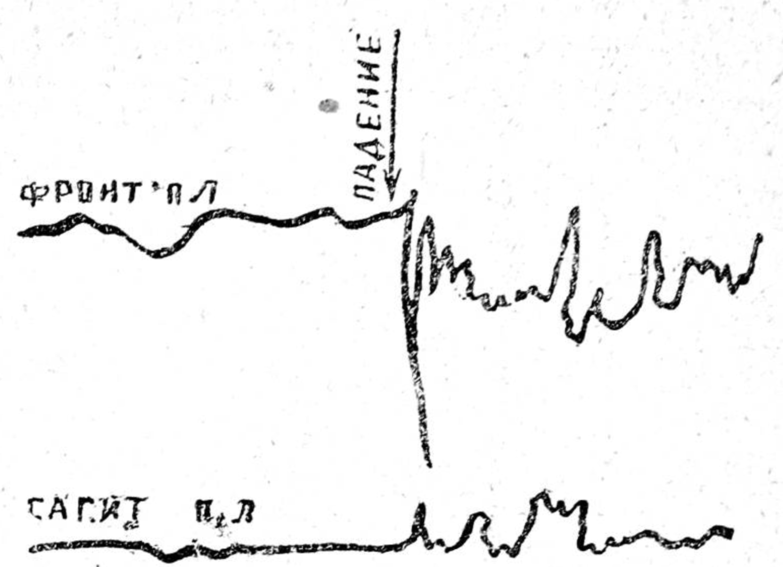 Второй тип кривой получается в тех случаях, когда полной устойчивости испытуемый не обнаруживает. В этих случаях либо обе кривые (фронтальная и сагитальная), либо одна из них дает после падения платформы усиление колебаний, как это видно на рис. 4.