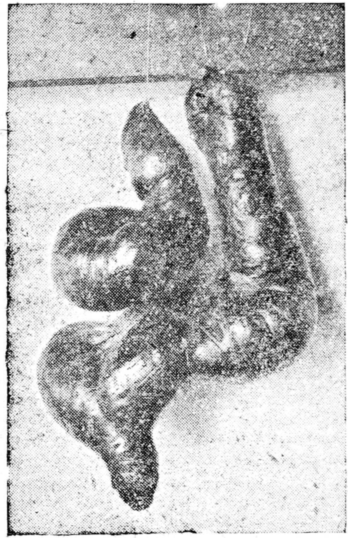 Диагноз: Правосторонняя пахово-мошоночная грыжа. В грыжевом мешке предположено наличие спаянной с грыжей, воспаленной и утолщенной части сальника. 5/II под местной инфильтрационной анэстезией 1/4о/о новокаина произведено грыжесечение. Разрез кожи параллельно Пупартовой свясже до апоневроза. Рассечен апоневроз. При выделении грыжевого мешка верхушка последнего оказалась спаянной с прилежащими тканями. С внутренней стороны у шейки вскрыт грыжевой мешок. У внутреннего отверстия пахового кольца обнаружена петля тонкой кишки, от которой в грыжевой мешок тянется полый отросток без брыжейки длиною около 6—7 см. и шириной несколько меньше наличием значительного количества спаек. Произведена герниолапоротомия. В рану выведена петля предлежащей кишки. Верхушка дивертикула отделена от грыжевого мешка. На брыжейке тонкой кишки, соответственно расположению дивертикула, имеется резкое уплотнение, инфильтрат и местами рубцовое сморщивание с наличием фибринозного налета на брыжейке и кишке. Выше этого участка конец тонкой кишки резко расширен, мышечный слой приводящего отдела кишки гипертрофирован. Отводящий канал кишки мало изменен. Произведена резекция тонкий кишки на протяжении 60—70 см. вместе с дивертикулом. Ввиду значительного несоответствия между просветами приводящего и отводящего концов кишки, был наложен анастомоз бок о бок. Культя брыжейки перитонизирована. Дивертикул располагался на тонкой кишке на расстоянии 35—40 см. от Баугиниевой заслонки. Брюшина зашита наглухо. Паховой канал восстановлен по способу Жирара. В нижний угол раны подведена марлевая турунда. Швы на кожу. Послеоперационное течение гладкое, без осложнений. Через 2 суток удален из раны марлевый тампон. На 5-й день больному разрешено ходить, на Q-й день сняты швы. Рана зажила первичным натяжением. 20-го февраля больной в хорошем состоянии выписан домой.