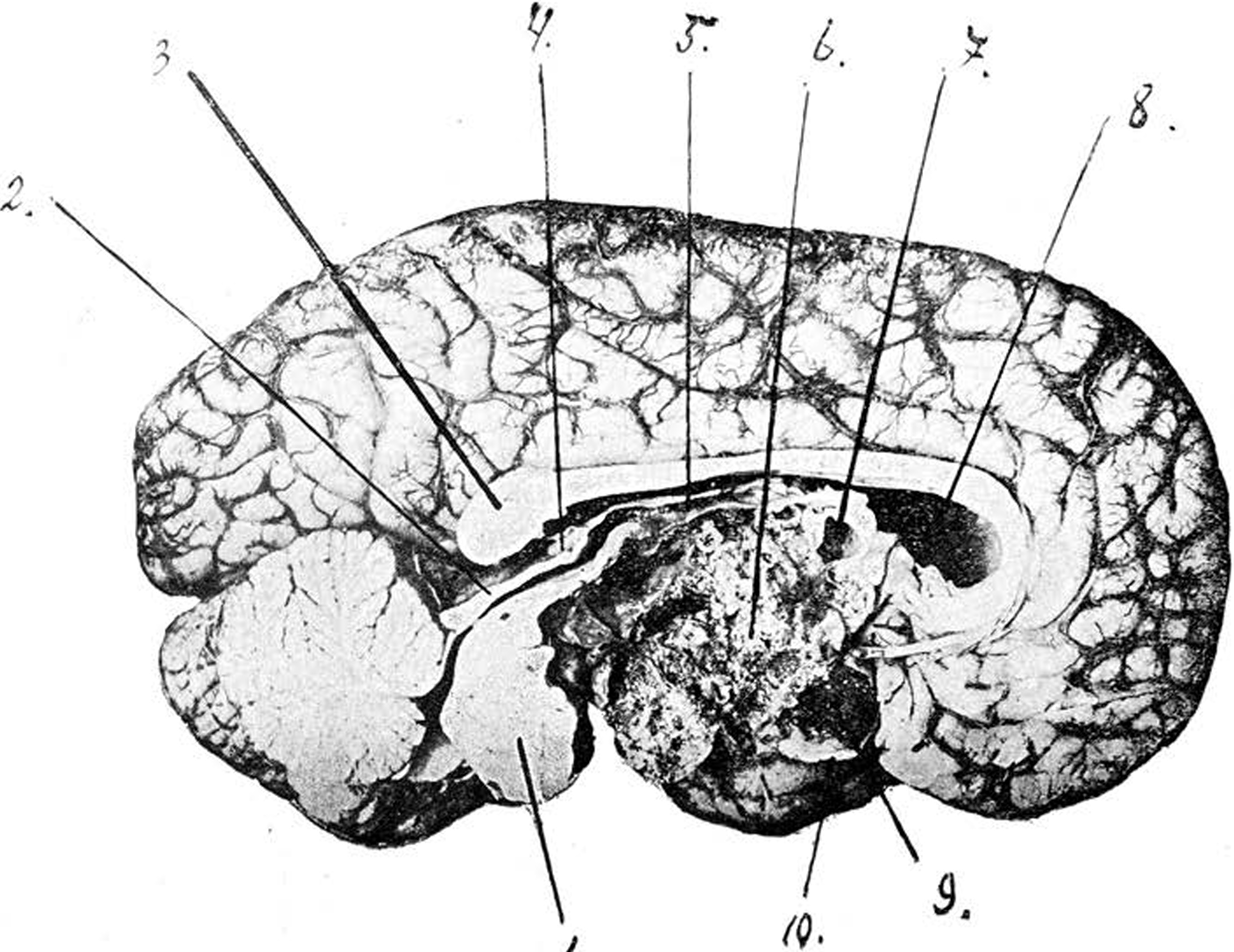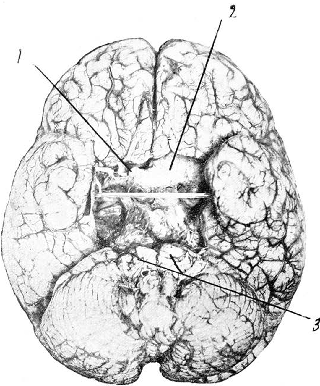Итак в данном случае злокачественное новообразование,—по-видимому, остеосаркома (микроскопическое исследование всего случая будет предметом особого сообщения),—совершенно разрушила средний мозг по средней линии, оттеснив стенки третьего желудочка вверх к corpus callosum. Мост, мозжечек, часть латерально расположенных ножек и прилегающая кора подверглись только некоторому сдавлению.