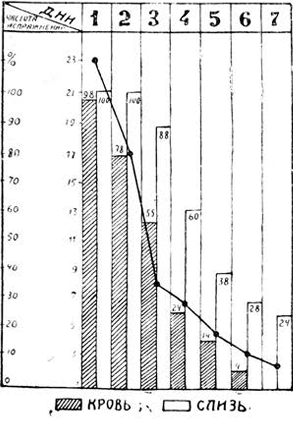 Как видно из прилегаемой диаграммы, где приведена средняя частота стула на одного больного в сутки, уже на 3-й день лечения количество стула падало больше, чем наполовину, а на 5-й день оно достигало ¼ первоначального. Результаты окажутся еще убедительнее, если принять во внимание, что в счет вошли здесь и случаи со смертельным исходом, где применение вакцины было начато слишком поздно. С уменьшением количества стула шло также уменьшение тенезмов, исчезали из стула кровь и слизь, болезненные же ощущения в животе держались несколько долее, хотя через несколько дней (3—4 дня) и они утихали. Вместе с общим улучшением у больных понижалась и температура; только при позднем применении вакцины, когда были налицо сильная интоксикация и обширные анатомические изменения в кишечнике, падение температурной кривой задерживалось. Чем раньше было начато применение вакцины, тем скорее и лучше получался терапевтический эффект,—факт, подтверждаемый также Аlivasatos’oм, Глуховым и Березневым.