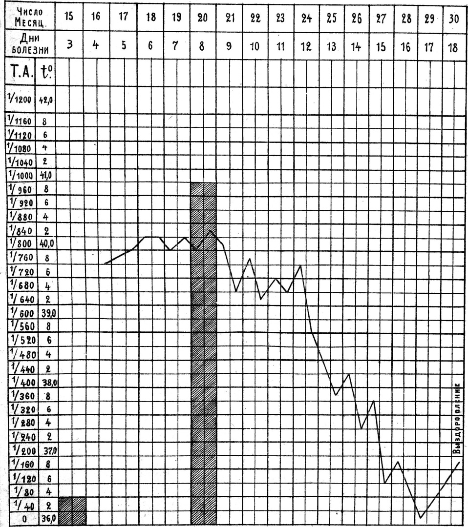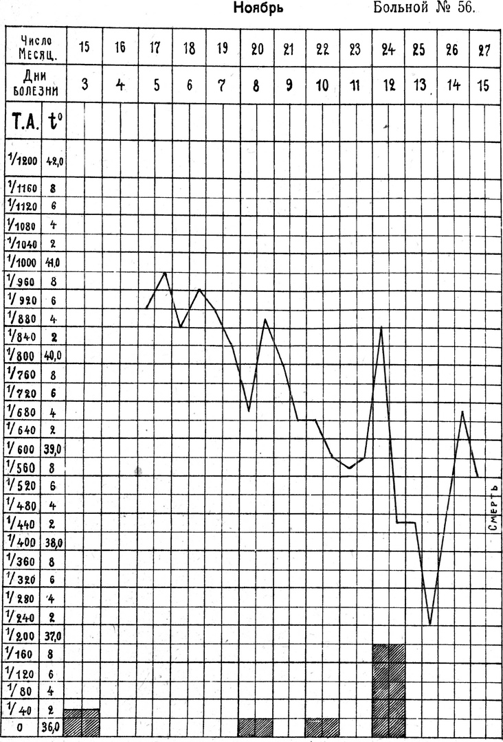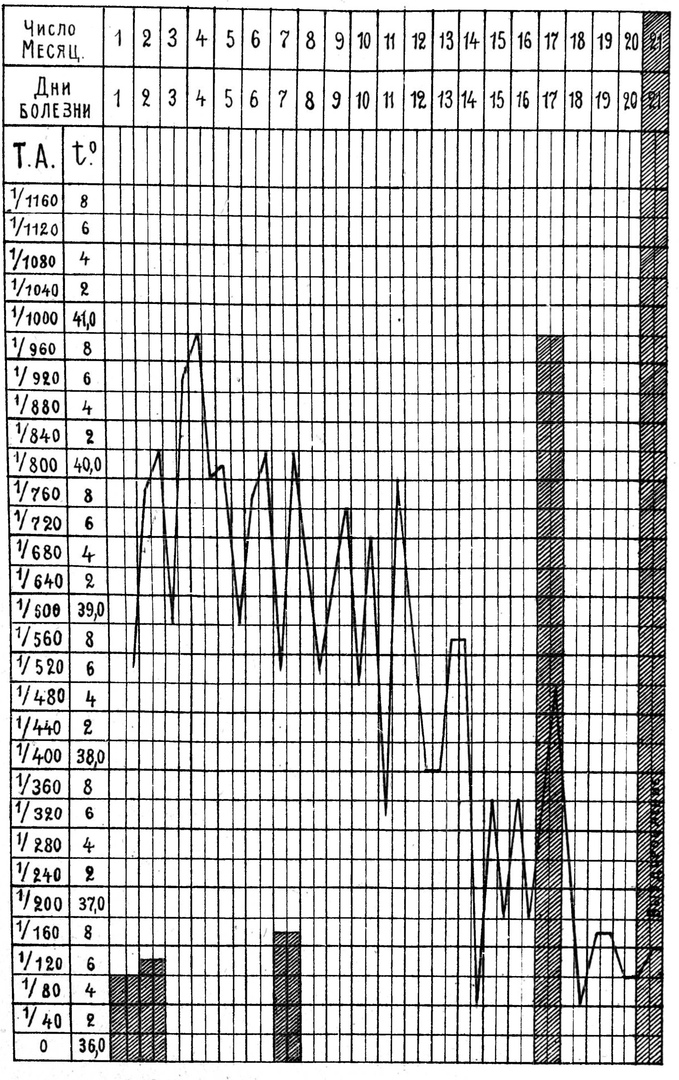 В заключение я хотел-бы остановить внимание еще на одном обстоятельстве. Наблюдая динамику образования противотел в течение болезни у привитых, мы заметили, что энергия, с какой организм обогащается противотелами, и исход борьбы организма с инфекцией в большинстве случаев стоят в определенной зависимости, т. ч. по кривой нарастания агглютининов мы до известной степени можем судить об успешности борьбы и ставить прогностику заболевания. В случаях легкого течения сыпного тифа, напр., мы наблюдаем, что титр агглютинации в первые же дни болезни достигает очень высоких цифр; в случаях тяжелого течения нарастание кривой агглютининов происходило очень вяло и достигало высоких цифр только к концу заболевания, близко ко дню падения t°; наконец, в случаях смертельной инфекции мы не раз подмечали, как титр агглютинации у привитых не только не повышался, а наоборот, показывая ясную тенденцию к понижению в первые дни болезни и лишь в дальнейшем—приблизительно со второй половины течения болезни—начинал, и то очень медленно, повышаться, не достигая тех высоких цифр, какие приходилось наблюдать в случаях благоприятного течения болезни (см. прилагаемые кривые, где графически отмечены титр агглютинаций tº).иммунные тела, образующиеся под влиянием вакцинации proteus’oM, только в известной части тождественны с противотелами, образующимися при иммунизации организма специфическим возбудителем сыпного тифа и обусловливающими у человека иммунитет против этой болезни. Наличность же в соках организма только той группы иммунных тел, которая является общей и для proteus а, и для специфического возбудителя сыпного тифа, еще не может обусловить состояния иммунитета против сыпного тифа. Здесь, таким образом, мы имеем аналогию с тем, что наблюдается при тифозных и паратифозных инфекциях: несмотря на наличность общих антигенных свойств у b. typhi abdominalis и b. paratiphi, мы знаем, что иммунитет, напр., против брюшного тифа вовсе не служит препятствием для заболевания паратифом. Таким же образом наличность специфических иммунных тел против proteusa не препятствует развитию у человека сыпнотифозной инфекции, во время которой организм получает со стороны специфического антигена толчок к образованию целого ряда защитных противотел, в том числе и по отношению к b. proteus vulgaris х/9> как это происходит и на самом деле.