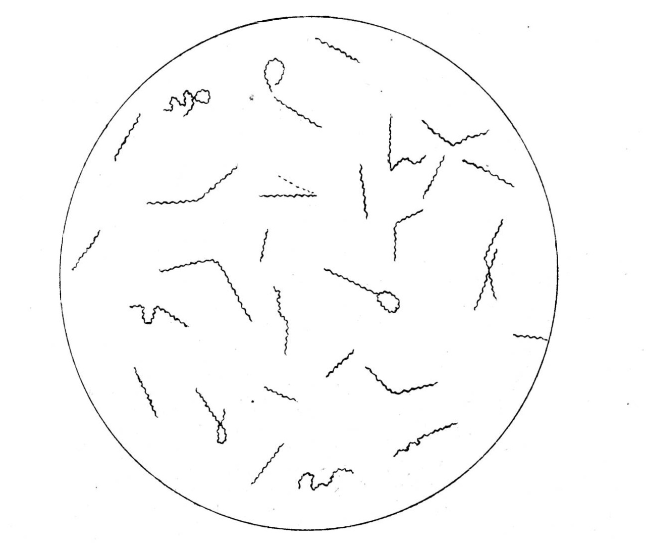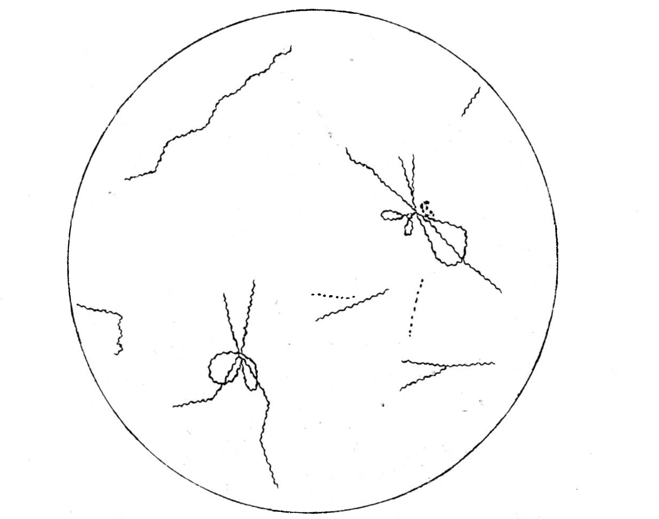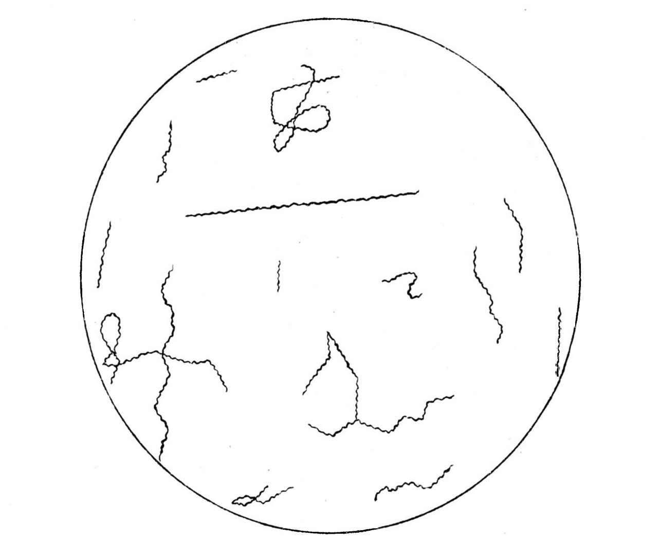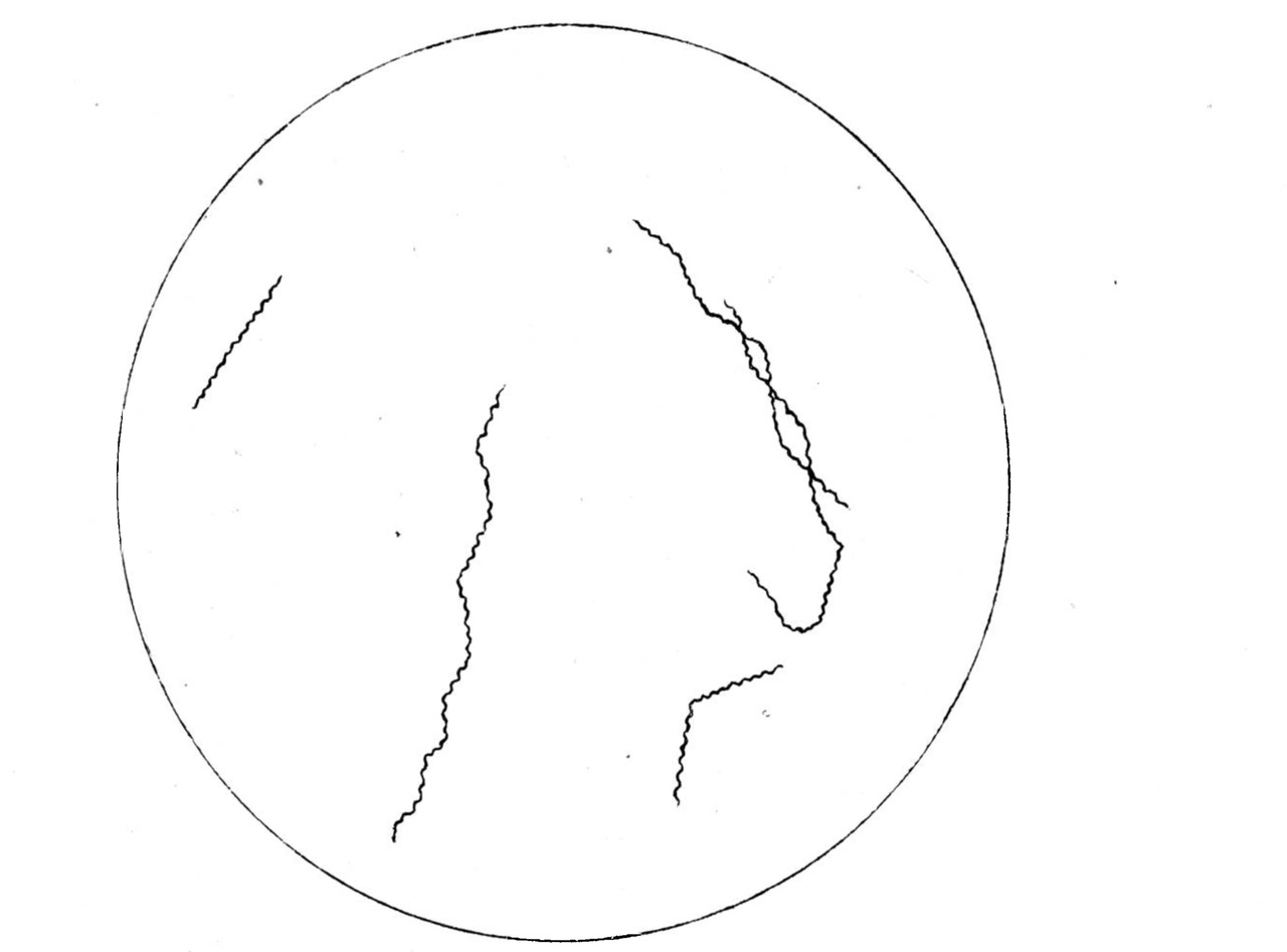 Исходя из этих соображений, я прежде всего попробовал заменить „свежую" ткань и „свежий" кровяной сгусток более индифферентным с химической точки зрения веществом—свернутым белком куриного яйца. Куриное яйцо, лишь-бы оно не обладало явными признаками порчи, варится обычным образом ввод: „вкрутую", после чего белок тщательно отделяется от желтка и делится ножом на кусочки объемом в 1-2 куб. сайт., которые распределяются по пробиркам. Белка из одного куриного яйца достаточно для заполнения 12—15 пробирок. Затем в пробирки прибавляется по 8 куб. сайт, физиологического раствора хлористого натрия; в таком виде пробирки стерилизуются в автоклаве при 120º в течение 15 минут. Остается теперь добавить всюду по 4 куб. сайт, не нагретой лошадиной сыворотки, и среда готова для посева. На приготовленной таким образом питательной среде мне удалось получить с первого же раза очень богатую культуру спирох Obermeiera. Достаточно посеять 1—2 капли крови больного, чтобы через несколько дней при температуре 37°C. получить богатую культуру,—когда при рассматривании капли питательной среды пот микроскопом в поле зрения видно 30—40 спирохет, а иногда и больше. Генерации полученных из крови человека спирохет удаются легко, и в настоящее время я имею в лаборатории 19-ю генерацию первого штамма, выкультивированного из крови больного два месяца тому назад. Развитие культуры идет быстрее, чем это описывают Nogouchi и Hata. Обычно maximum роста достигается па 4—5 день. В культуре можно видеть формы спирохет, отличающиеся по длине и взаимному расположению: наряду с очень короткими спирохетами встречаются экземпляры, по крайней мере в 10 раз превышающие их по длине; большею частью спирохеты располагаются отдельно одна от другой, но вместе с тем можно видеть и аггломерати спирохет, состоящие из 5—6 особей, образующих очень красивые фигуры звезд с расходящимися в разные стороны лучами; иногда можно бывает отметить, как две спирохеты, большею частью длинные, перевиваются, переплетаются одна вокруг другой подлиннику; встречаются, наконец, фигуры, которые проще всего трактовать, как явление поперечного деления спирохет, и которые характеризуются тем, что две спирохеты, большею настаю короткие и находящиеся в оживленном движении, соединены между собою тоненьким, едва заметным мостиком, имеющим вид очень нежной нити. Нужно отметить, что в зависимости от периода развития спирохет в культуре преобладают те или другие формы. Длинные спирохеты, звездообразные фигуры и перевивающиеся формы появляются в культуре в первые дни роста: наоборот, для периода maximum'a роста является характерным как- бы наводнение культуры мелкими формами спирохет, прядающими картине однообразный вид. (См. прилагаемые рисунки).