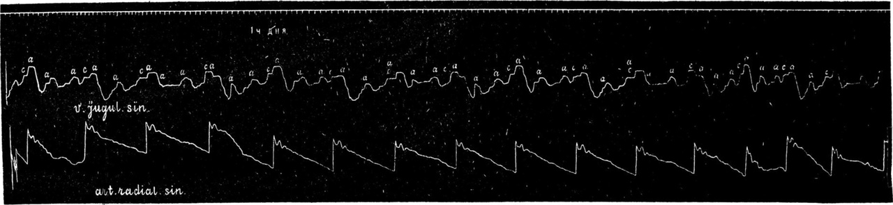 На сфигмофлебограммах нашего больного можно было видеть следующее: 1) волны а, являющиеся выражением сокращения предсердий, следовали вполне ритмично по отношению друг к другу, и их на сфигмсфлебограммах было от 56 до 85 в 1, тогда как частота артериального пульса па тех же сфигмофлебограммах была 27—28 ударов в 1; 2) взаимоотношение волн а и с, т. е. отношение по времени систолы предсердий к систоле желудочков, было крайне изменчиво,—то оно было нормальным, и волна а предшествовала волне с, отстоя от нее на расстоянии не более 0,2 секунды, то волна а начинала постепенно приближаться и сливаться с волной с в последнем случае расстояние от а до с равнялось нулю, т, е. мы имели одновременное сокращение предсердий и желудочков,—и в этом случае комбинированная волна а+с являлась на флебограмме очень высокой, вследствие того, что кровь, не имея возможности излиться при систоле предсердий в желудочки, тоже сокращавшиеся в этот момент, вся устремлялась вверх и вызывала большое набухание шейных вен; иногда расстояние от волны а до волны с равнялось безконечности, т. е. за волной а следовала не с, а новая волна а; это значит, что сокращение предсердий не сопровождалось, как в норме, сокращением желудочков, а за систолой предсердий шла новая систола предсердий; 3) на одной из сфигмофлебограмм можно было видеть несколько экстрасистол; экстрасистолы эти—желудочковые, так как давали на флебограмме всего один зубец с который находился на таком же расстоянии от предшествующаго зубца с, как начало экстрасистолического подъёма на кривой радиального пульса отстояло от начала предшествующего нормального подъёма радиального пульса; экстрасистолы, как то всегда бывает в случаях полной поперечной диссоциации сердца, никогда не сопровождались компенсаторной паузой (9, 10).