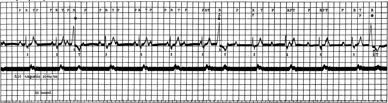 - На электрокардиограммах можно было подметить несколько экстрасистол, возникавших в правом желудочке. Эти экстрасистолы давали небольшую волну на радиальном пульсе и, как то всегда