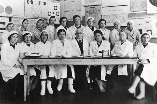 Рис. 3. Коллектив кафедры микробиологии в 1950 г. (в центре сидит заведующий кафедрой профессор А.Э. Озол)