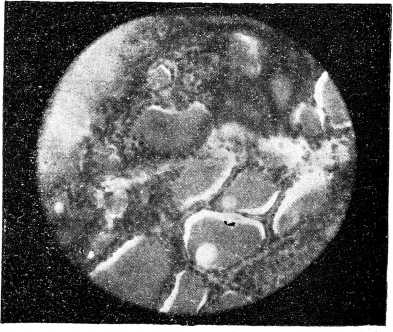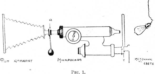 Установив все, как указано выше, можно приступить и к фотографированию. Вращая кремальер фотографического аппарата и микрометрический внит микроскопа, добиваются того, чтобы на матовом стекле получилось резкое изображение препарата. Затем манипулируют осветительным прибором, а диафрагмами усиливают резкость изображения и при получении нужной картины фотографируют обычным путем. Для того, чтобы на пластинку не попадал посторонний свет, щель между объективом и окуляром (а на рис. 1) закрывают черной материей.