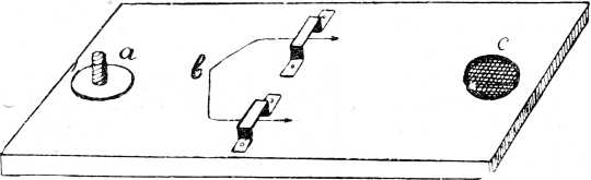Берется продолговатая, квадратной формы доска, на которой вделывается винт от фотографического штатива, или специально заказанный, и на нем укрепляется фотографический аппарат. Для установки микроскопа к доске привинчиваются или прибиваются гвоздями скобки b, соответствующие подставке последнего. Прежде, чем укреплять винт и скобки, предварительно всю систему необходимо, конечно, установить в таком положении, при котором препарат даст изображение на матовом стекле, а это будет тогда, когда центры всех отверстий—объектива фотографического аппарата, окуляра и объектива микроскопа - будут совпадать, т. е. лежать на одной горизонтальной линии. Установить аппараты в таком положении можно при помощи нитки, которую протягивают через отверстия револьвера микроскопа, окуляра и объектива аппарата, затем фиксируют и устанавливают все части так, чтобы нитка приходилась в центре всех отверстий, а на доске отмечают данное положение для фотографического аппарата и ножек микроскопа и после этого врезывают винт и скобки. Для источника освещения фиксирующих приспособлений можно не делать, а очертить на доске место, с которого получается наилучшее освещение.
