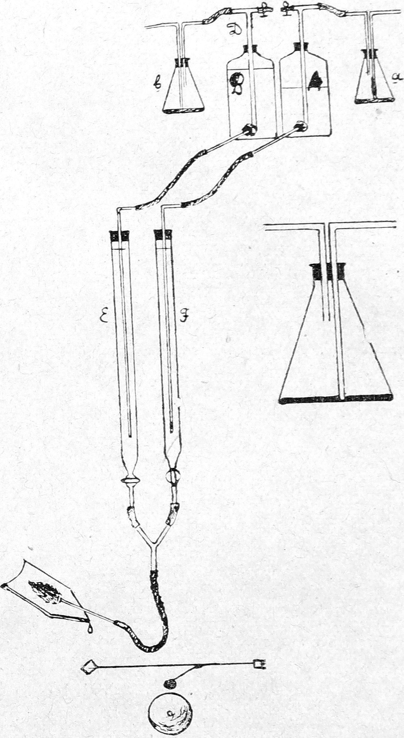 Нами был поставлен ряд опытов по вопросу о влиянии эманации радия на просвет сосудов. Об’ектом служило изолированное ухо кролика (методика Н. П. Кравкова). О состоянии сосудистого просвета мы судили по количеству оттекающей жидкости в единицу времени, именно, в одну минуту. Изучение влияния эманации затруднялось тем, что последняя есть газ и, как всякий газ, летуча; поэтому, растворяя ее, необходимо было поставить эксперимент в такие условия, чтобы соблюсти постоянство концентрации раствора с одной стороны и постоянство давления, под которым жидкость втекает в приводящую артерию уха,—с другой. Для этого нами была использована система двух мариоттовских сосудов (см. рис. 1), снабженных ртутными вентилями (а, b), не дающими возможности газу из мариоттовской склянки уходить в запаянном капилляре. Капилляр разбивается в верхней части стеклянной трубки Д в совершенно глухом, не сообщающемся с атмосферой пространстве. Затем 5—6-кратным взбалтыванием сосуда освободившийся газ распределяется в жидкости. Жидкость остается в покойном состоянии 4 часа, для того, чтобы эманация пришла в равновесие со своими продуктами распада. Затем, проверив систему в отношении одинакового стояния уровней жидкостей в обеих бюретках, Е и F, приступаем к опыту.