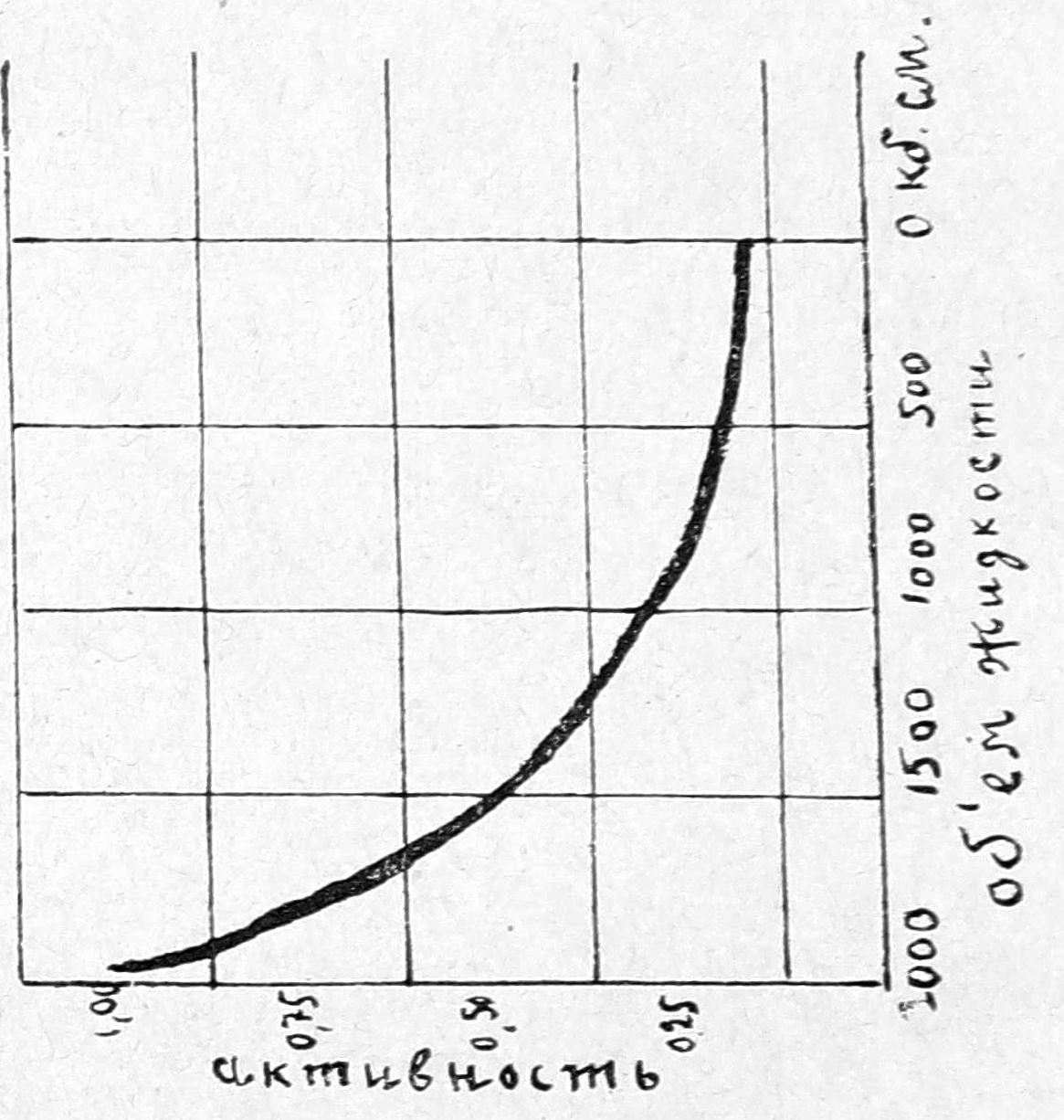 Приводимые ниже на диаграммах дозы указаны те, которые имелись вначале каждого опыта. К концу его активность насыщенной эманацией R. - L. жидкости убывала, при средней продолжительности опыта в 3 часа, наполовину. На рис. 2 изображен этот процесс убывания активности R. - L. жидкости в зависимости от изменения ее об’ема. График получен экспериментальным путем при помощи электрометрических измерений сотрудником Гос. Радиевого Института Р. А. Эйхельбергером. Коэффициент растворимости эманации Ra в R. - L. жидкости равен 0,33, т. е. несколько больше, чем в воде, где он равен 0,25 при комнатной t°. Таким образом фактически в R. - L. жидкости эманации Ra при каждом данном опыте было больше в 1,32 раза, чем в таком же об’еме воды.