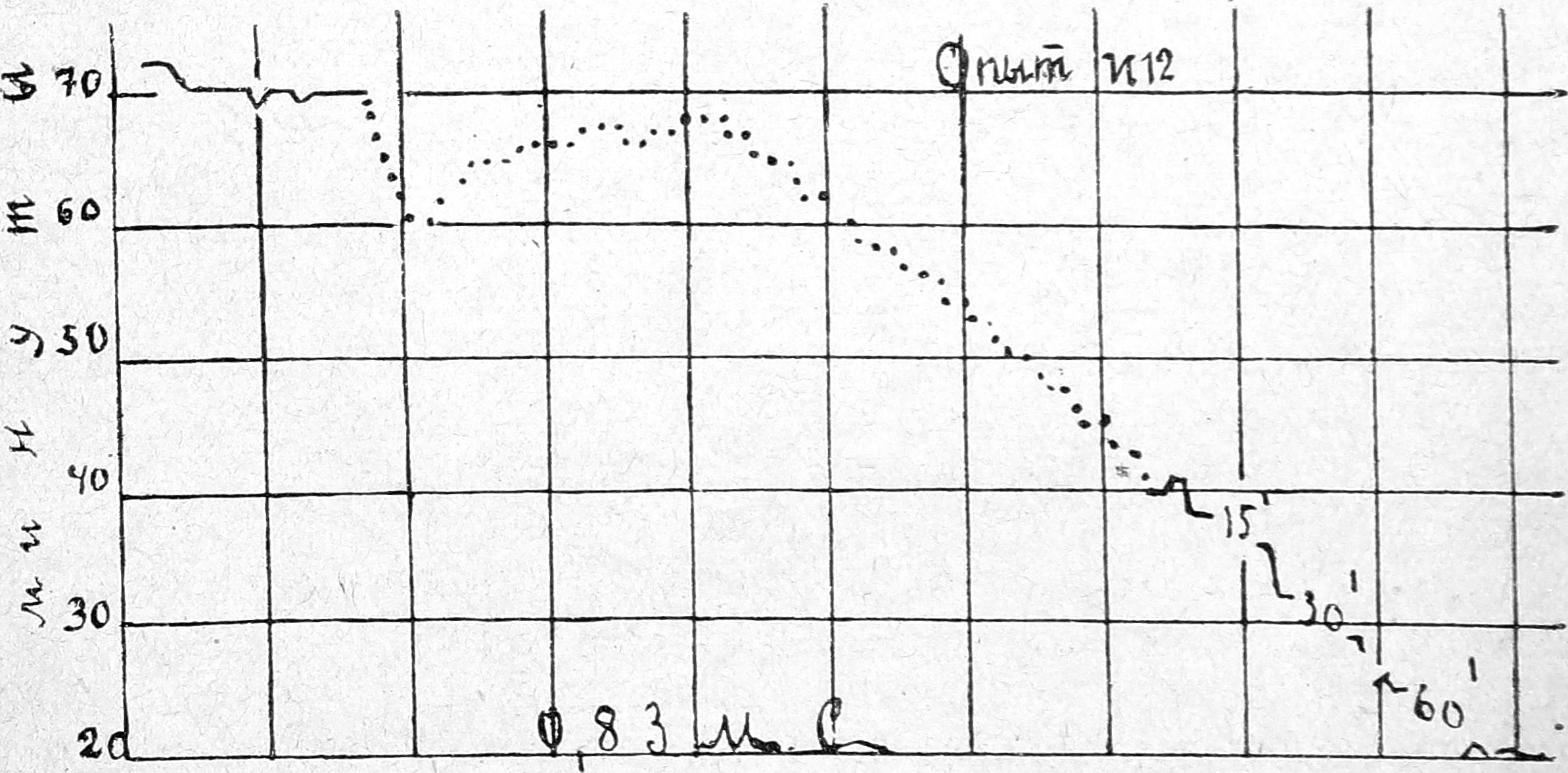 При любезном содействии сотрудников Гос. Радиевого Института, мною было поставлено совершенно новое дополнительное исследование касательно коэффициента растворимости эманации радия в Ringer-Lоске’овской жидкости, так как литературных указаний на этот счет не имеется. Кроме того было поставлено несколько специальных электрометрических исследований с целью выяснить ту поправку в концентрации эманации, которую надо вносить в каждый опыт в связи с особенностям постановки его. Опыты мы старались проводить в идентичных условиях: температуры, времени и давления. Температура, в среднем, была 18°—19°С, продолжительность опыта—3 часа, давление водяного столба в бюретках— от 65 до 70 см.