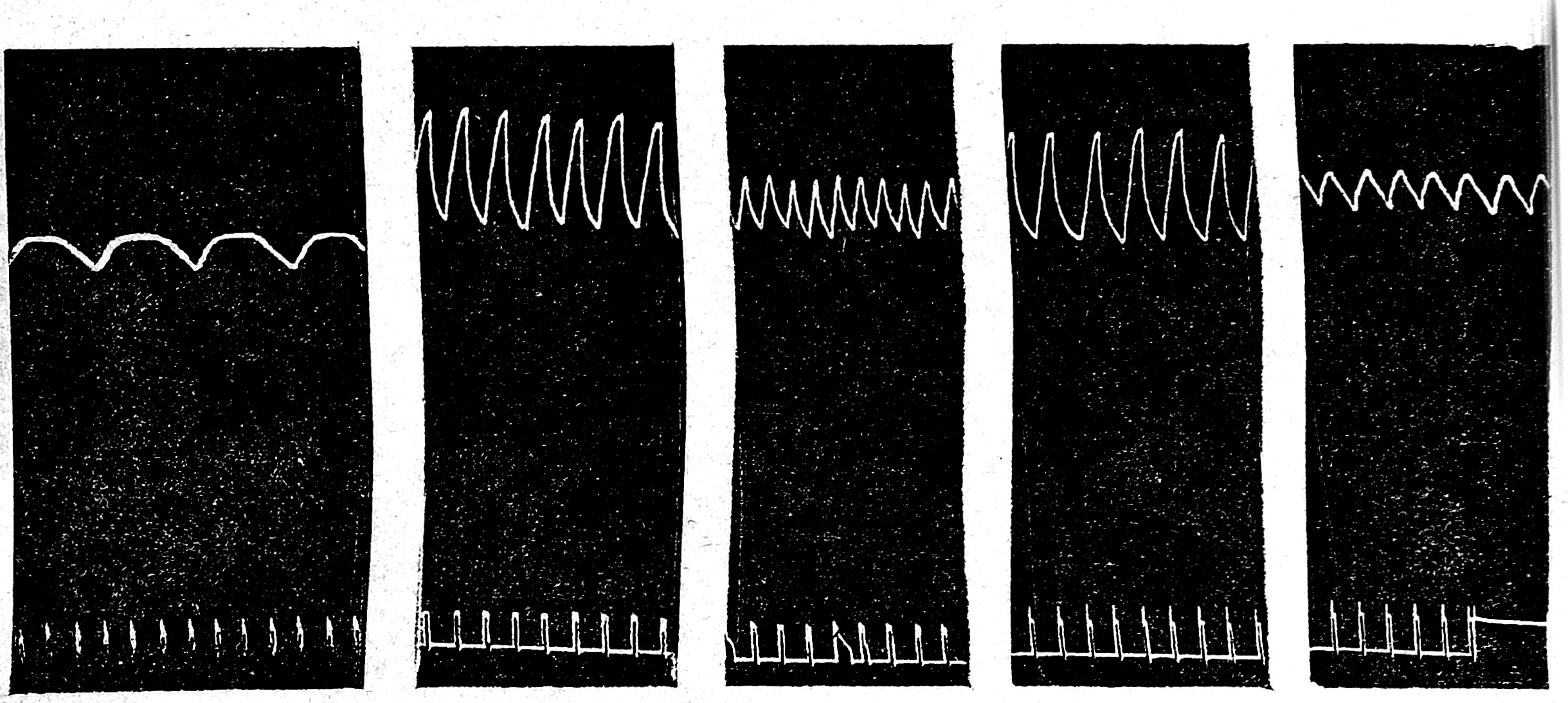 Во всех моих опытах я регистрировал дыхательные движения грудной клетки при помощи торакографа Маrеу'я, каковой прибор соединялся через посредство резиновой трубки с мембраной и производил записи на закопченной ленте вращающегося барабана. На этих записях опущение кривой соответствовало вдоху, под’ем—выдоху.