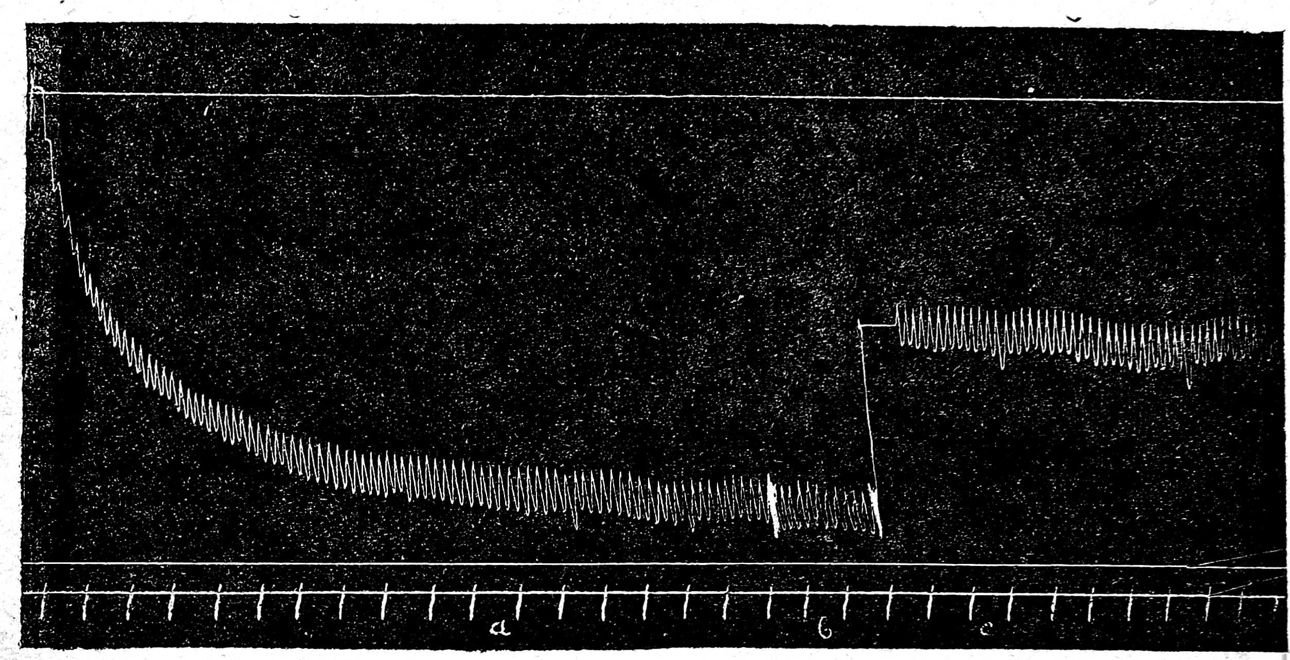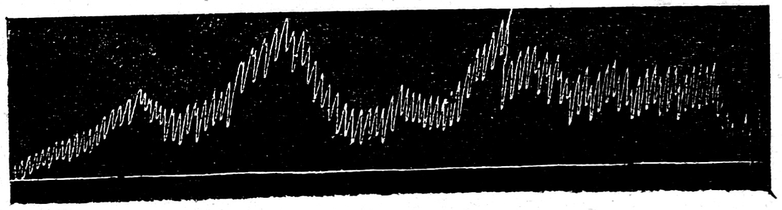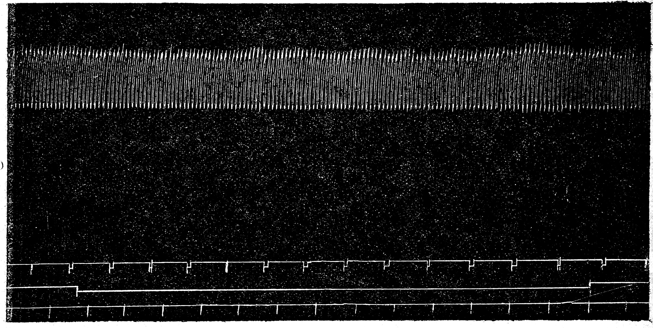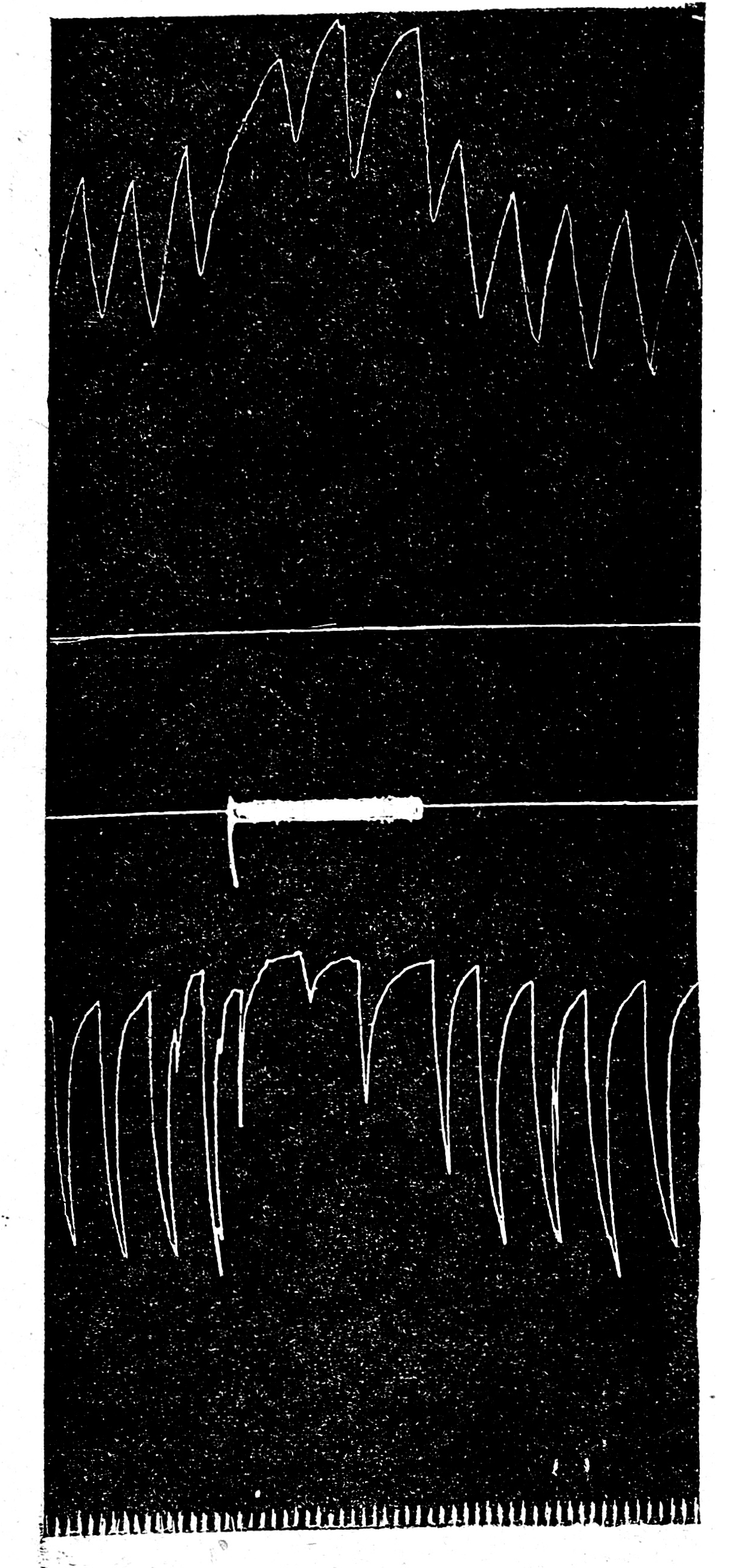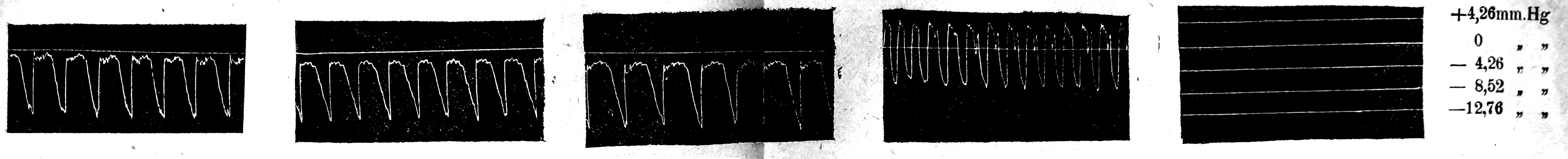 Заслуживает, далее, внимания кривая, полученная мною после того, как воздух из обоих плевральных мешков был предварительно полностью удален высасыванием ртом через посредство каучуковой трубки, соединенной с плевральными канюлями. Просматривая ее, можно констатировать, что после такого удаления воздуха дыхательные экскурсии грудной клетки по сравнению с нормой заметно уменьшаются в глубине и увеличиваются в ритме; изменяются также некоторые детали на линиях, отмечающих фазы вдоха и выдоха: эта разница, несомненно, обусловлена изменившимися рефлекторными влияниями, т.к., грудная полость, перенесшая вскрытие, уже никоим образом не может быть приведена к идеально-нормальным условиям, как-бы тщательно не был воздух удален из плевральных мешков.