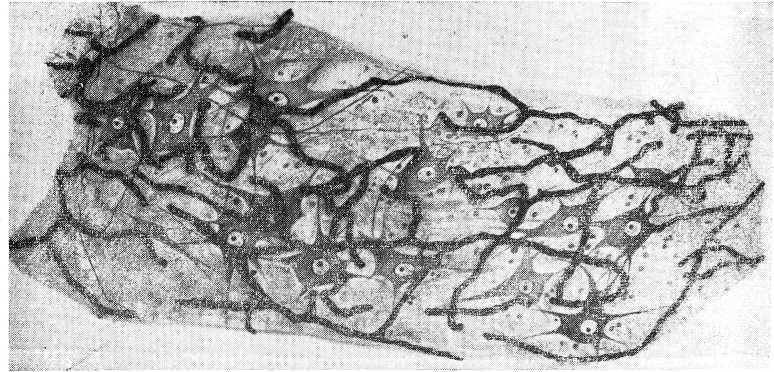 Рис. 1. Взаимоотношение двигательных нервных клеток с капиллярами в передних рогах поясничного утолщения спинного мозга человека. Мальчик 7 лет. Поперечный срез толщиной 90 мк. Реакция на щелочную фосфатазу по методу Гомори. Ок. 7. Об. 40.