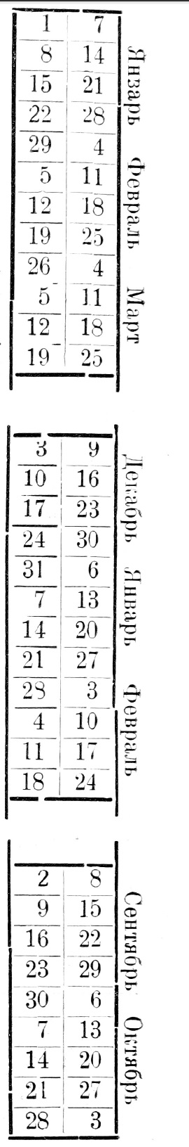 Для механизации этого подсчета я предлагаю свою счетную линейку. Каждое деление этой линейки равно 1 сантиметру и на каждом делении имеются цифры, обозначающие числа месяцев, расположенные так что каждое деление линейки соответствует одной неделе (1—7, 8—14, 15—21, 22—28, 29—4 и т.д.); соответственно этим числам над ними пишутся названия месяцев; линейка имеет всего 93 делений, вмещающих числа от 1-го января до 3-го ноября следующего года.