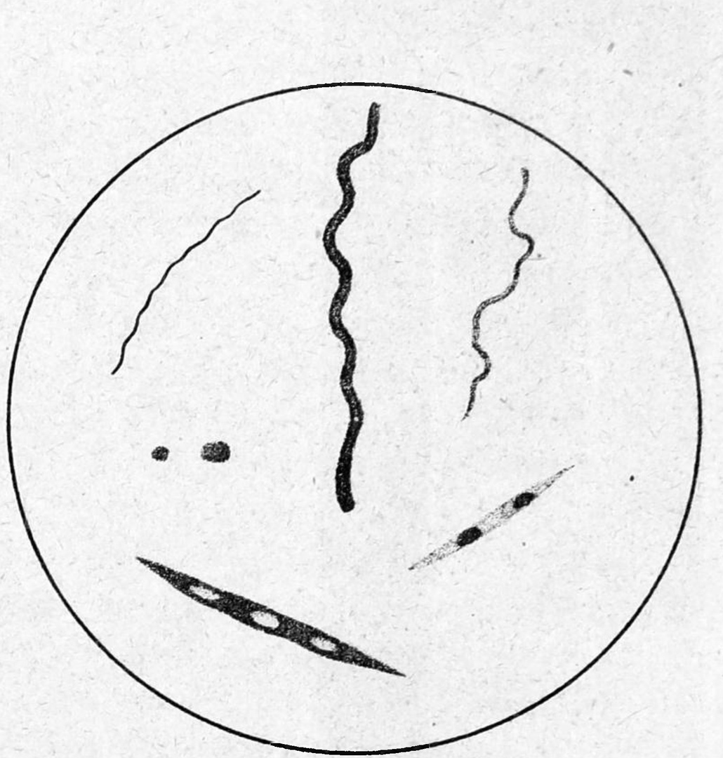 Спирохетами мы называем штопорообразно извитых, активно изгибающихся микробов, движения которых весьма характерны,— они представляются то змееобразными, то буравящими, то вращательными, причем вращение происходит вокруг воображаемой продольной оси, а у некоторых спирохет доказана, по-видимому, наличность т. наз. „осевой палочки“. Движения эти могут совершаться, на более или менее значительное расстояние, или в направлении кпереди, или в обратном направлении, хотя переднего конца у спирохет отличить от заднего —нельзя.