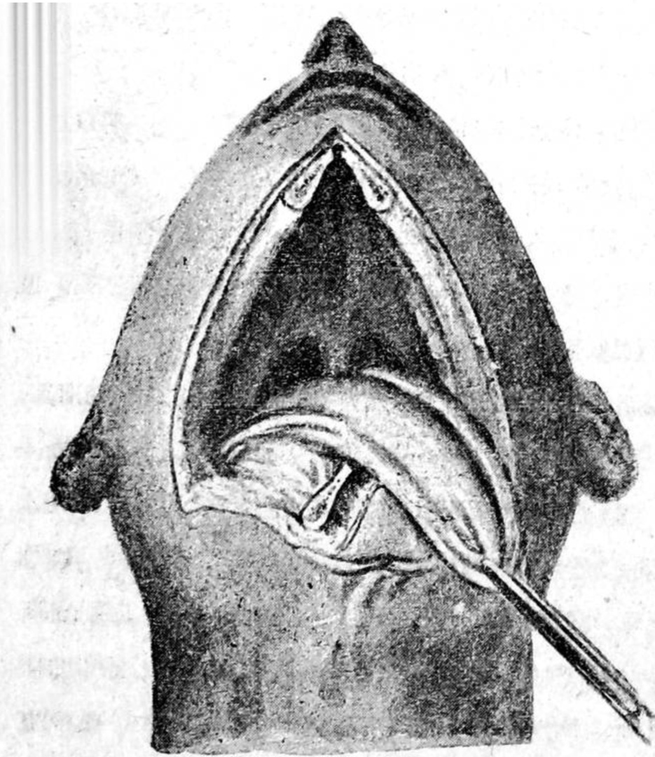 Перехода затем к способами, дающим широкий доступ к языку со стороны дна полости рта, замечу, что этот путь к языку впервые бил указан Cloquet. В 1827 году последний произвел у больного раком языка отвесный разрез от средины нижнего края челюсти до средины под язычной кости, проник между на mylohyoideus и m. genio-hyoideus в рот и через рапу ввел и наложил на больной язык экразер с целью отщемлении опухоли. В 1838 году Regтоllі. а затем Siamattei, Czerny и Billroth предложили сходные способы вскрытия дна полости рта путем, образования кожно-мышечного лоскута из мягких частей дна ротовой полости. В виду значительного сходства этих способов между собою, а равно и потому, что способы Regnоlli - Вillrоth’a излагаются в учебниках, напр. Esinarch-Kowalzi g’a, Tiellmans’a и др., я подробно их приводить не буду. Укажу только, что общим для всех этих способов является то, что авторы их выкраивают из мягких частей дна полости рта, через дугообразный или дугообразно т-образный разрезы, лоскут из кожи, мышц и слизистой оболочки дна полости рта. причем прикрепления мышц к. spina mentalis обязательно перерезываются (ножом или ножницами—по Вillгоth’y). На последнее обстоятельство а особенно обращаю внимание читателей Язык выводится через рану в regio suprahyoidea Способы эти не получили большого распространения, и понятно, почему: дело в том, что отсечение таких важных мышц, как genio-giossus, лишает язык опоры, обусловливает его западение и - ведет в послеоперационном периоде к так ваз. Schlückpneumonie (Кuttner). Таких образом, вышеуказанные способы, по-видимому, имеют лишь историческое значение.