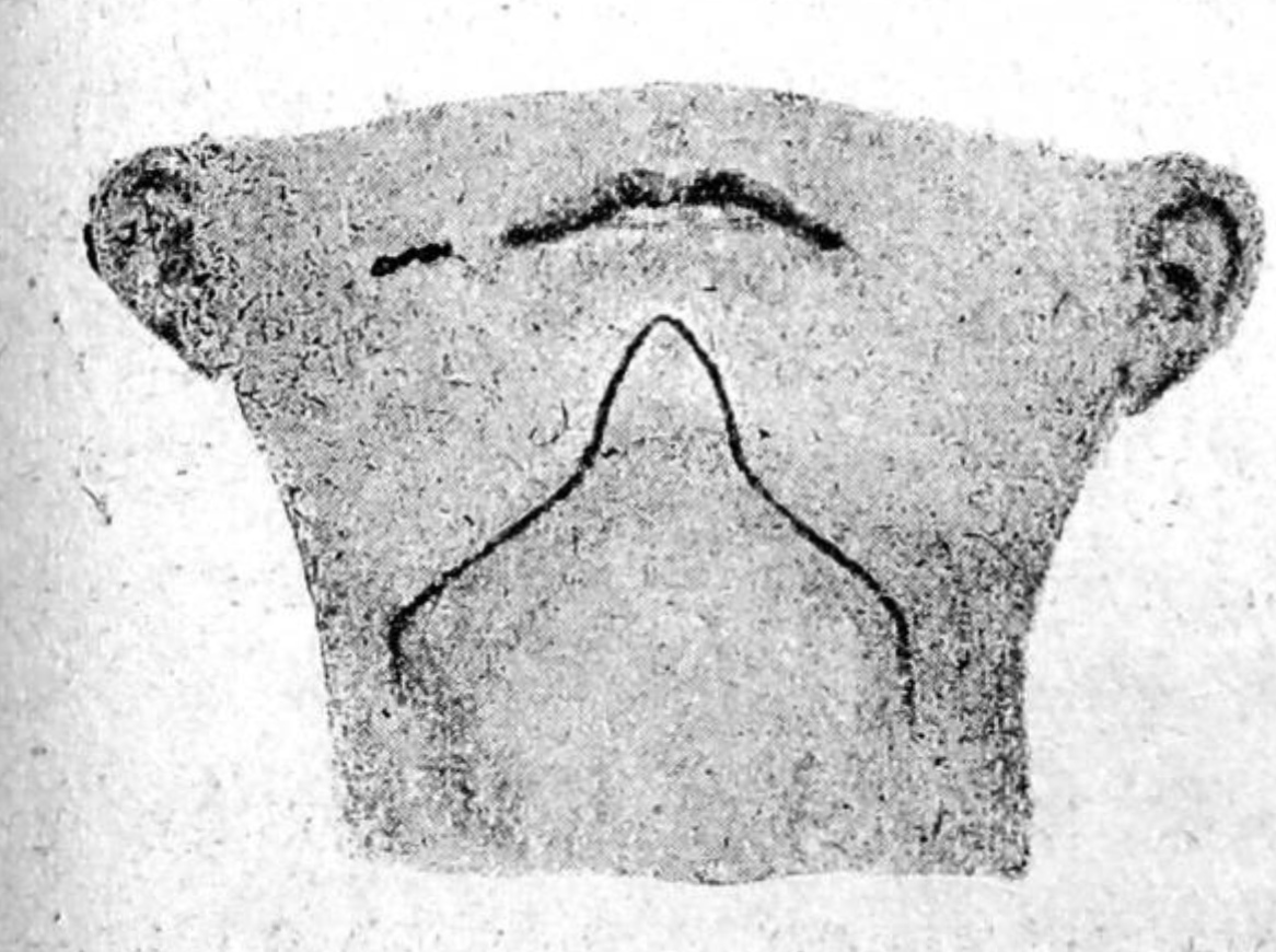 Образовавшийся при этом лоскут откидывается книзу (см. рис.II), причем мягкие части легко могут быть отделены до самых дужек, и язык извлечен пулевыми щипцами далеко вперед и вниз. Доступ открывается не только ко всем отделам языка, но и глотке (особенно к дужкам, миндалинам и мягкому небу — до надгортанника). Удаление языка через такую рану не может представлять затруднений. Перевязка сосудов при этом может быть сделана или вначале, в шейных ранах, или язычные артерии можно отыскать после образования лоскута, идя со стороны слизистой дна полости рта. Что касается шейных разрезов, для удаления лимфатических желез, то разрезы по внутренним краям ш. sterno-cleido-mastoidei, углообразно заходящие в нижние шейные треугольника, конечно, легко могут быть соединены с основным резекционным разрезом и вполне заменяют крестообразный разрез Кüllner’a. Укрепление треугольного куска кости достигается проволочным швом с одной стороны, для чего перед распилом ее высверливаются два отверстия. Это укрепление может, быть достигнуто и кожными швами совместно с пращевидной повязкой челюсти.