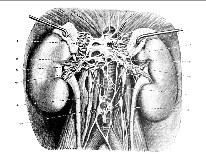 Рис.1. 1-g. semilurane dext; 2-g. aortico-renale dext. 3-g. mesent. sup. dext; 4-g. renale inf. dext;5-пограничный столб n. sympathici (справа); 6-g. mwsent. inf. dext. 7-g. semilunare sinist.; 8-g. aortico-renale sinist; 9-g. mesent. sup. sinist.; 10-g. renale ant. sinist.; 11-пограничный столб n. sympathici (слева); 12-g. mesent. inf. sinist